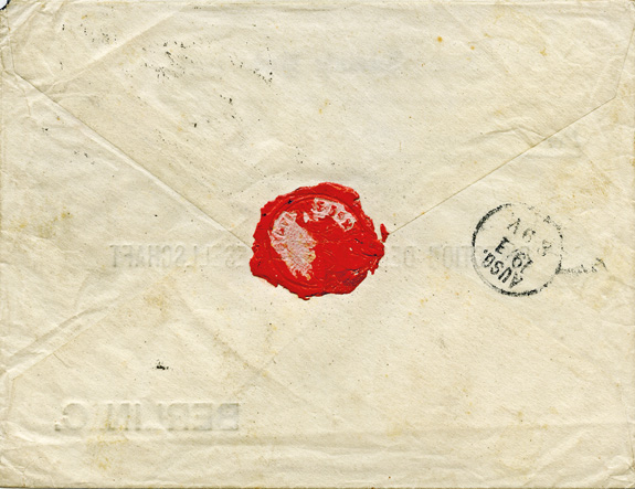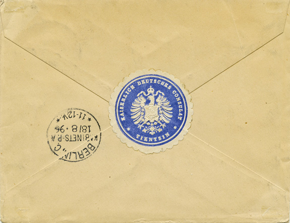 04.07.1896: Vorläufer Viererblock 10Pf (Mi.V47) mit Stempel KDPA TIENTSIN auf schönem Brief an die "Kaiserliche Regierungskasse" in BERLIN (18.8.96). Rückseitig blaue Siegelvignette "KAISERLICH DEUTSCHES CONSULATE * TIENTSIN".