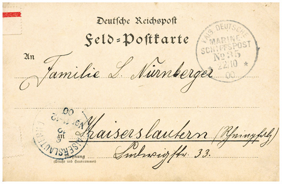 22.10.1900: Feldpost-Karte aus "Shanghai-kuan, 19.X.00" mit Seepoststempel MSP No.35 (= SMS "Weißenburg") nach KAISERSLAUTERN (6.12.00). Interessanter Vorläufer-Beleg aus Shanhaikuan vor Errichtung der Feldpoststation No.8 am 27.11.00!