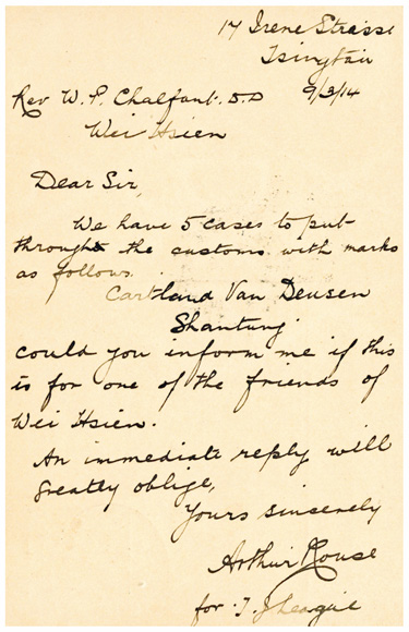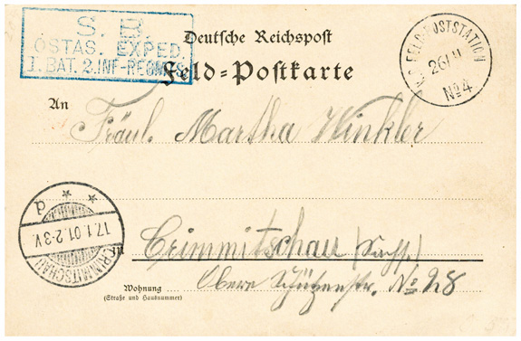 26.11.1900, vor Eröffnung der Feldpoststation Shanhaikuan: Feldpostkarte geschrieben in "Ling-Schong i.Novmb 1900" mit Stempel K.D.FELDPOSTSTATION No 4 & blauem SB-Stempel "OSAS. EXPED. I.BAT. 2.INF-REGMTS" nach CRIMMITSCHAU (17.01.01); ArGe 300,-.