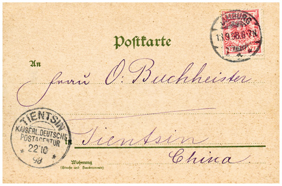 1898: Bedarfskarte mit DR 10Pf und Stempel HAMBURG (13.9.1898) nach China, Ankunftsstempel TIENTSIN KDPA (22.10.1898).