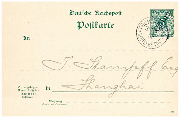 1902: zwei Ganzsachenkarten 5Pf & 10Pf jeweils mit einem Stempel TSCHINKIANG; rückseitg Blanko.