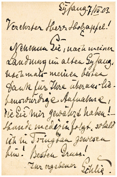 08.07.1903: 5Pf Ganzsachenkarte (Mi.P1) mit Bahnpoststempel TSINGTAU-WEIHSIN ZUG 1 (Typ Ia) an Herrn Holzapfel in Weihsin. Absender ist der Oberrossarzt Schlie aus Syfang.