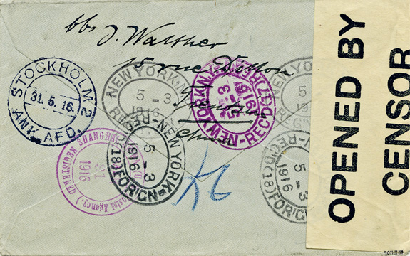 1916: zensierter R-Brief an den "Deutschen Hülfsverein Stockholm /Schweden" mit 2x 10 Cents (Mi.41) und 2x Stempel TIENTSIN "b" sowie R-Zettel "Tientsin" (Type 6by); links mit Zensurverschluss "OPENED BY CENSOR" sowie diverse Transitstempel der amerikanischen Post - SHANGHAI (31.3.1916), NEW YORK (3.5.1916) mit Ankunftsstempel in STOCKHOLM (31.5.1916). Absender : "J.Walther..Tientsin". Geprüft Bothe BPP & v.Willmann.