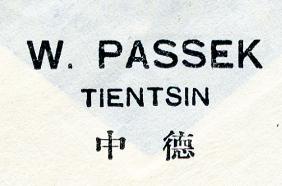 29.07.14: senkrechtes Paar 2 Cents (Mi.39) entwertet mit Stempel TIENTSIN"*a" (Arge 2) und Vermerk "Über Sibirien" auf Brief von "W. Passek, Tientsin" (rückseitiger Klappeneindruck) nach Blankenburg. Wegen Kriegserklärung Deutschlands an Rußland am 2.August 1914 wurde der Brief in Russland zensiert und mit dem Zensurstempel "I. II." (Arge 1) versehen; unsauber geöffnet.