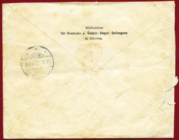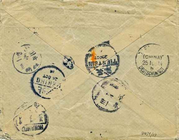 12.06.15: korrekt frankierter Einschreibe-Brief mit 14 Cent, als 4C & 10 C nach Deutschland, gestempelt TIENTSIN (CHINA)"b" (Arge 3), fleckig und links etwas beschnitten. Absender ist die "Hülfsaktion für Deutsche u. Österr.-Ungar. Gefangene in Sibirien.