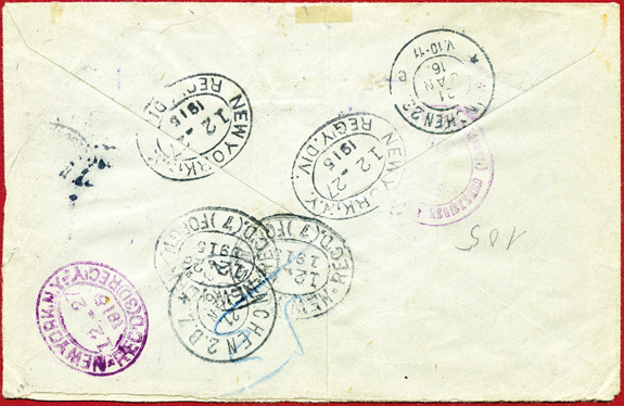 02.12.15: mit 20 Cents korrekt frankierter Einschreibe-Brief nach Deutschland. Nach dem 9. Sept 1915 war Auslandsporto vorgeschrieben. Gestempelt TIENTSIN (CHINA)"b"; R-Zettel Tientsien (Einfeld 6by) überstempelt REGISTERED (doppelt unterstrichen) und darunter Paginierstempel "1552". Hierzu Zitat aus Schmidt-Werner: "Da im Verkehr zwischen den amerikanischen Postämtern in Schanghai und San Francisko die Einschreibesendungen einzeln in die Briefkästen eingetragen wurden und die Auflieferung beim deutschen Postamt immer noch recht stark war, händigte das amerikanische Postamt dem deutschen Postamt einen Vorrat an seinen eigenen Briefkartenvordrucken aus, die beim deutschen Postamt fertig ausgefüllt wurden und beim amerikanischen nur noch unterschrieben zu werden brauchten, um dann nebst der ganzen deutschen Briefpost in die amerikanischen Postsäcke mit aufgenommen zu werden. Überstempelung des R-Zettels und Paginiernummer sind wahrscheinlich bei der Deutschen Post erfolgt und Indiz dafür, dass hier ein solcher Fall vorliegt. Kuvert etwas knittrig und Familienname entfernt. Rückseitig 8 saubere Stempelabschläge.