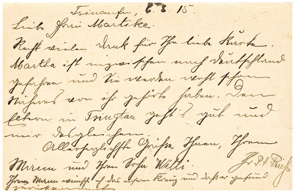 06.08.1915, Eingangszensur: klarer Stempel TSINANFU (CHINA) DEUTSCHE POST auf 2 Cents Antwort-Ganzsachenkarte (Mi.P16A) und violettem Eingangszensurstempel "Überwachngsstelle des XVIII.Armee-Korps * Frankfurt (Main) *" nach Potsdam. Seltene Zensurpost aus dem 1.WK!