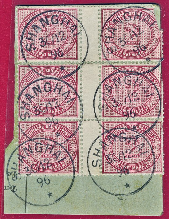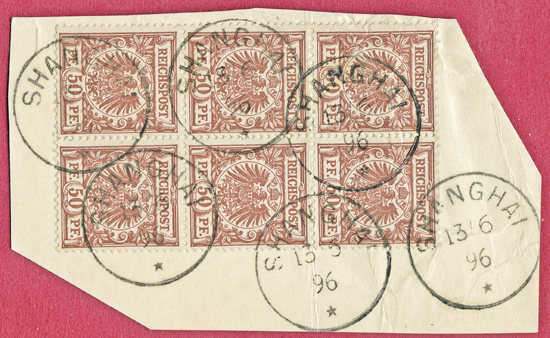 13.05.1896: senkrechtes 6er Block 50Pf (Mi.V50d) mit sauberem Stempel SHANGHAI (ArGe 2) auf Briefstück; geprüft Bothe BPP.
