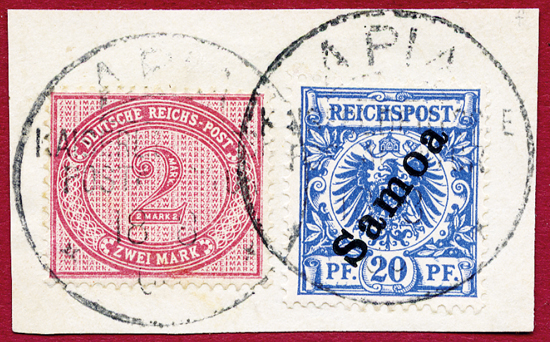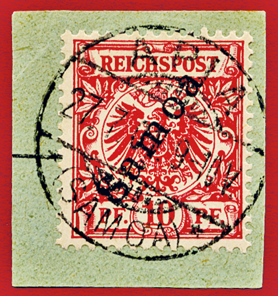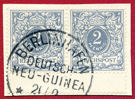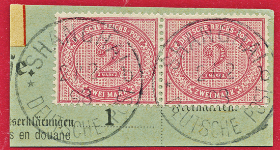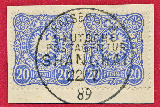 22.07.1889: waagerechtes Paar 20Pf (Mi.V42c) mit klarem Stempel KAISERLICH DEUTSCHE POSTAGENTUR SHANGHAI (ArGe 1) auf Briefstück.