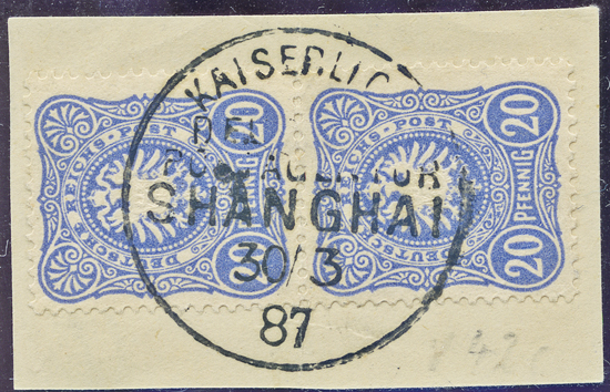 30.03.1887: senkrechtes Paar 20Pf (Mi.V42c) mit klarem Stempel KAISERLICH DEUTSCHE POSTAGENTUR SHANGHAI (ArGe 1) auf Briefstück; geprüft Bothe BPP.