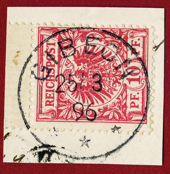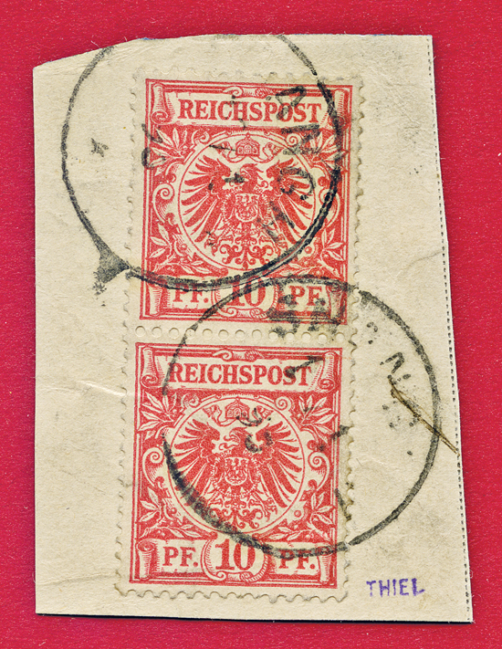 01.01.1895: senkrechtes Paar 10Pf (Mi.V47c) mit 2x Stempel SHANGHAI (ArGe 2) auf Briefstück; geprüft Thiel.