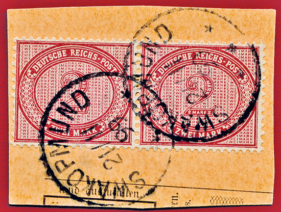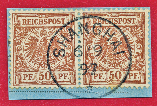 06.09.1897: senkrechtes Paar 50Pf (Mi.V50d) mit sauberem Stempel SHANGHAI (ArGe 2) auf Briefstück; geprüft Dr.Steuer.