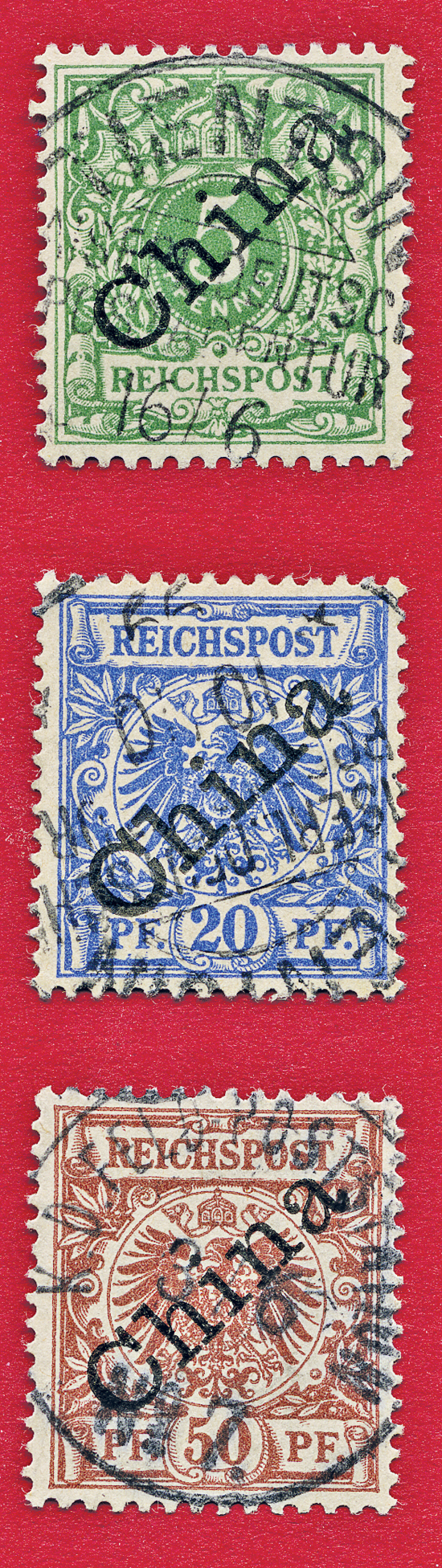 ca.1901: drei Marken mit 45 Grad "China" Aufdruck (Mi. 2I, 4I & 6I) mit Teilabschlägen, u.a. Tientsin & KDFP No.7.