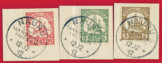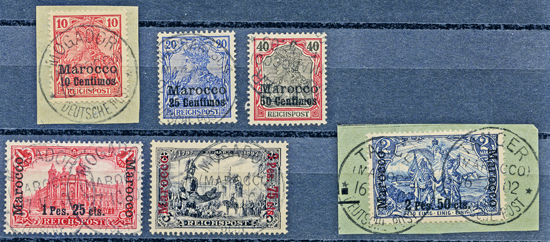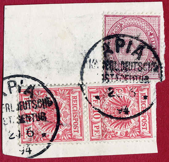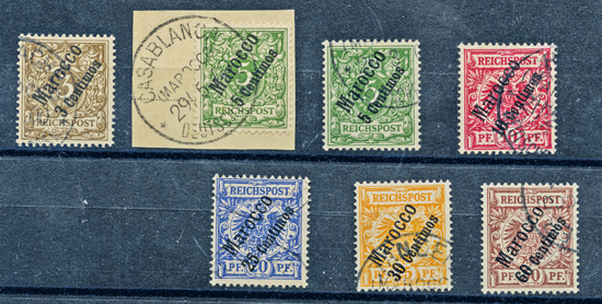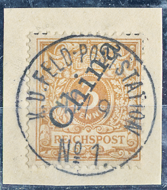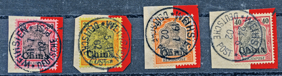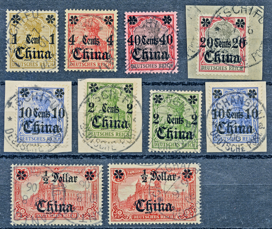 1901: kleines Lot von 12 Briefmarken und 4 Briefstücken (Mi. 15 bis 27 mit "China" Überdruck) mit unterschiedlichen Werten von 3Pf bis 2Mark mit Stempel von unter anderem von SHANGHAI, HANKAU & TSINGTAU WEIHSIN ZUG 2.