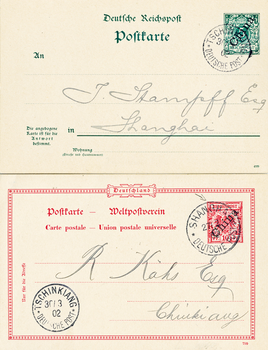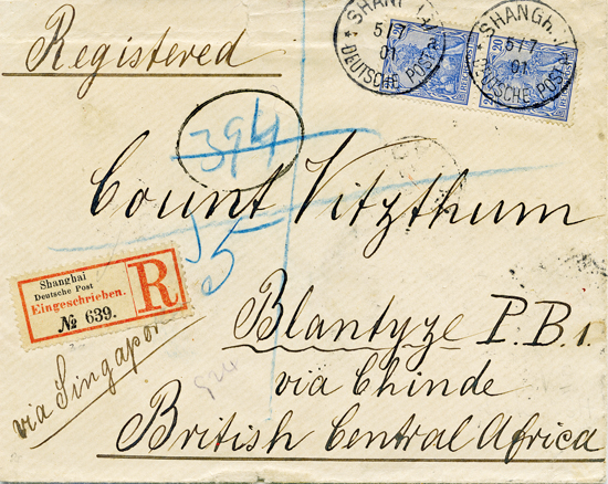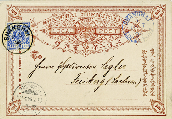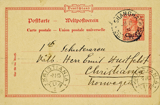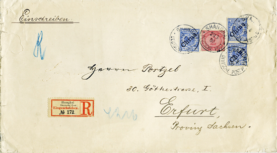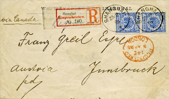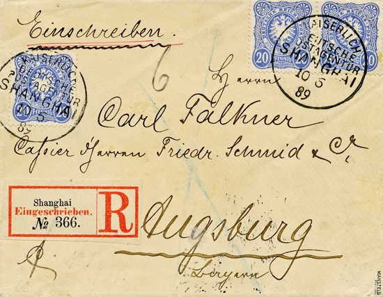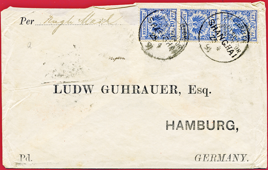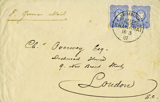 20.05.1887: Vorläufer Paar 20Pf, 10Pf & 50Pf (Mi.V42c, V41c & V44a) mit 2x sauberem Stempel KDPA SHANGHAI auf Vordruckbrief "M.Rohde, Shanghai" an Sydney Hudson in MANCHESTER (29.6.87); geprüft BOTHE BPP. Brief mit Beförderungsspuren.