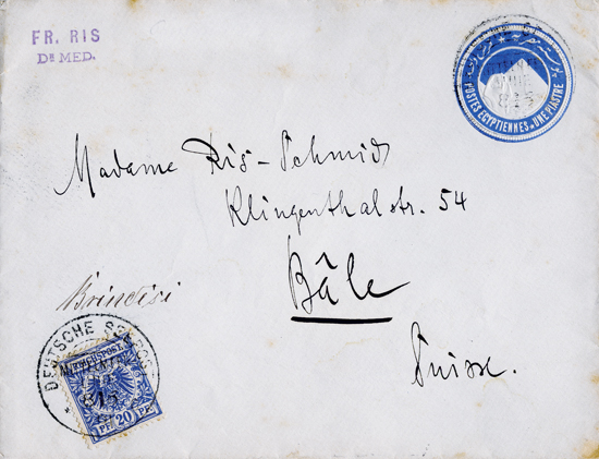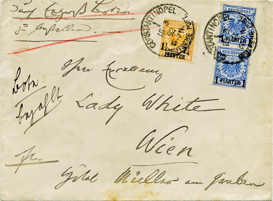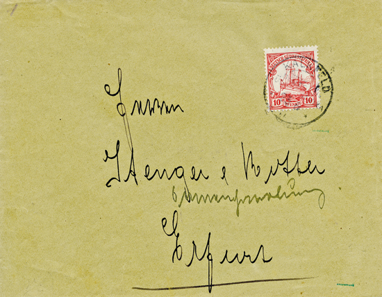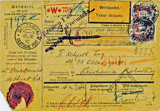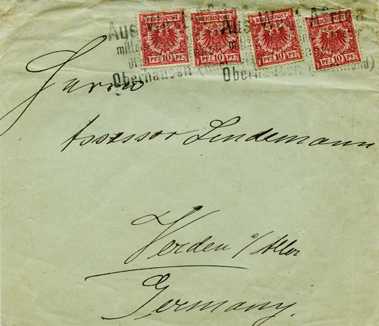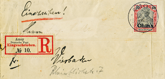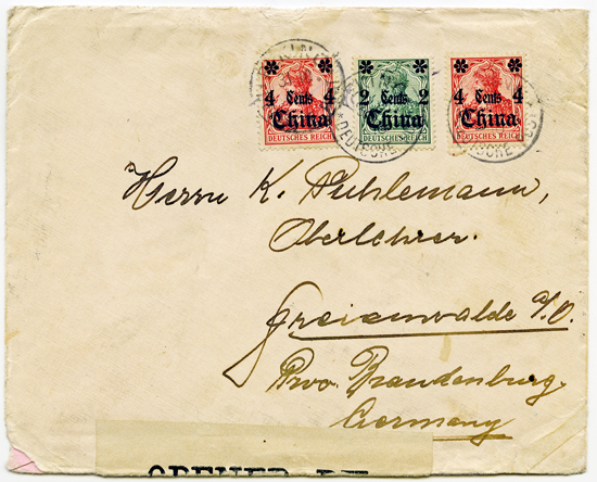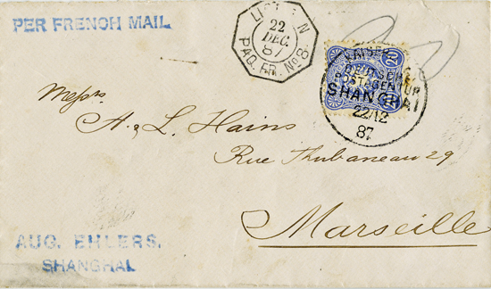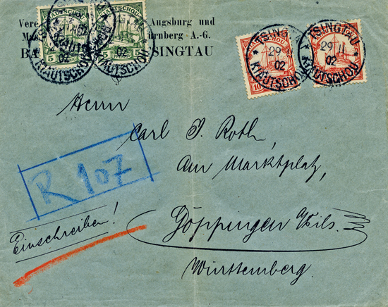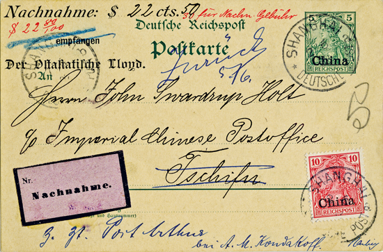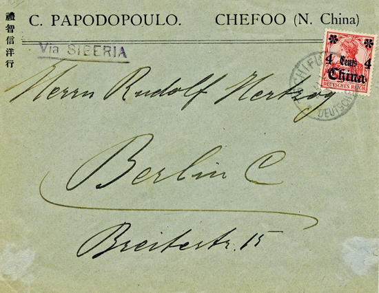 27.08.1887, vor Eröffnung der Postzweigstelle Tschifu: 6x 10Pf Vorläufer (Mi.V41b, Marken stockfleckig) mit 3x Stempel KDPA SHANGHAI auf Brief der 3.Gewichtsstufe mit Geschäftsstempel "ANZ & Co. / CHEFOO" an "Otto Anz" in DÜSSELDORF (rückseitiger AkSt 1.10.87) - zu diesem Zeitpunkt wurde die Post noch als Forwarded Post in Sammelumschlägen befördert. Umschlag Beförderungsspuren. Selten.