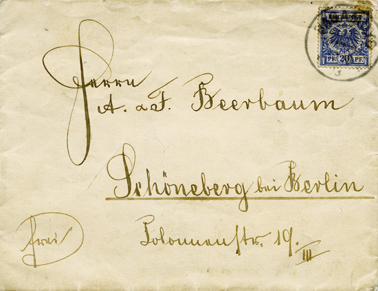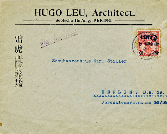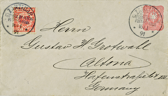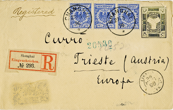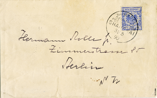 26.09.1891: 4x 20Pf Vorläufer (Mi.V48) mit 4x sauberen Stempel KDPA SHANGAI an eine "Actien Gesellschaft.." in BERLIN (3.11.1891); rückseitig Firmen-Ovalstempel "CARLOWITZ & Co / SHANGHAI"; geprüft Dr.Steuer. Umschlag Beförderungsspuren.