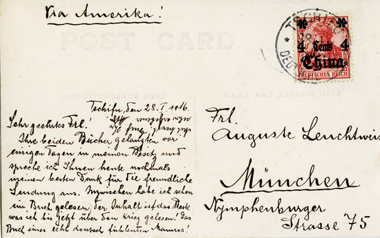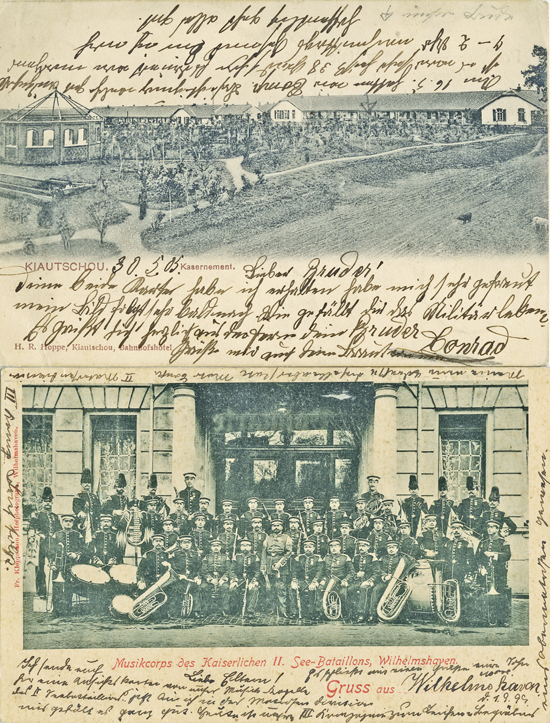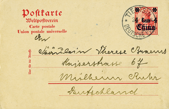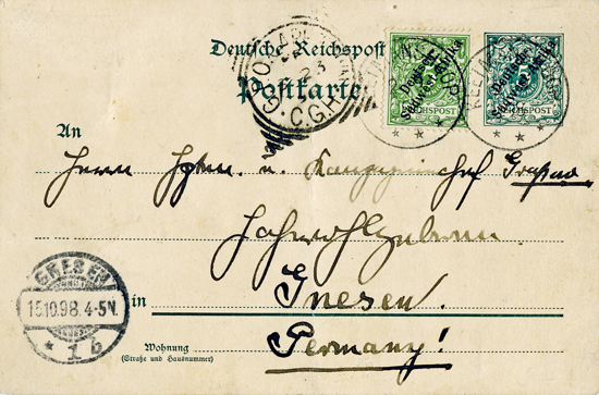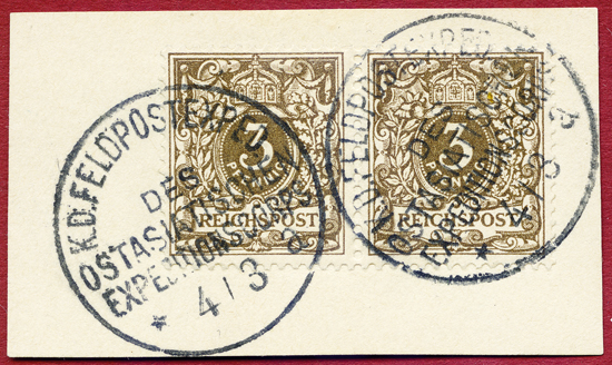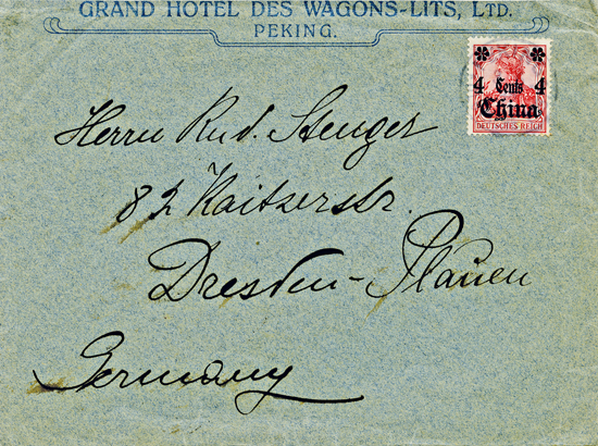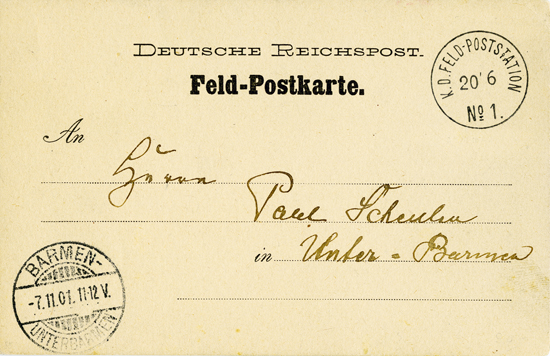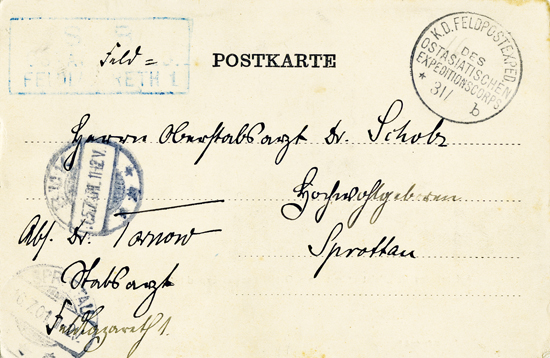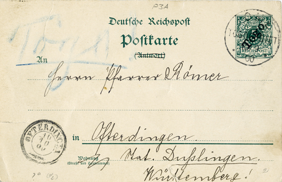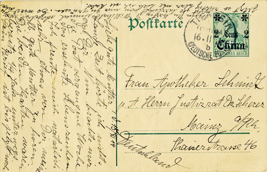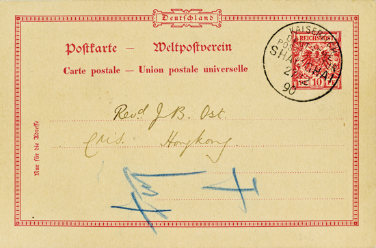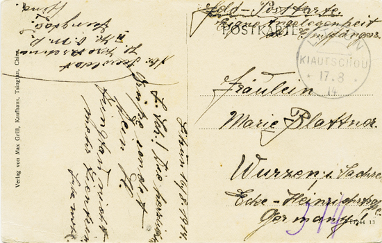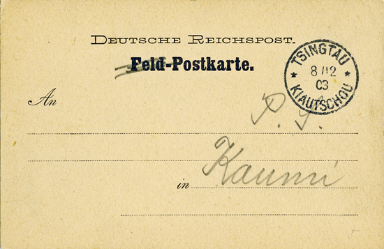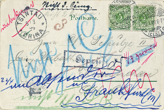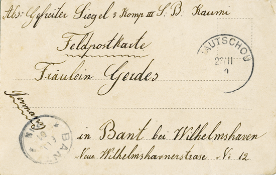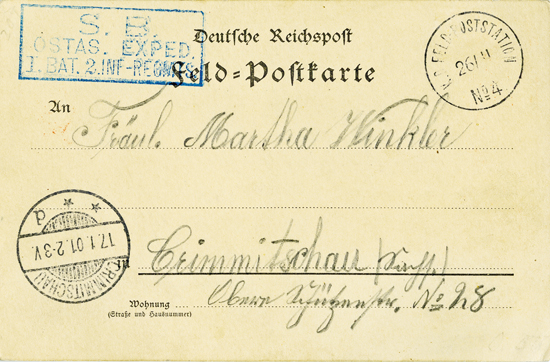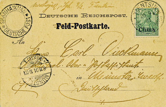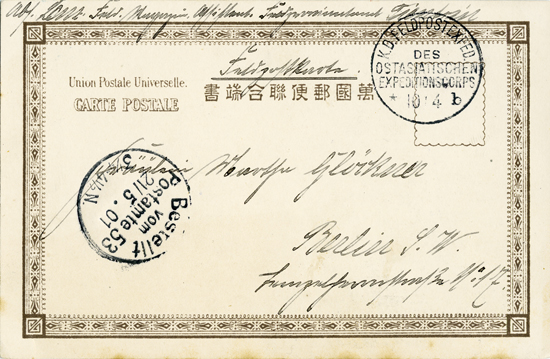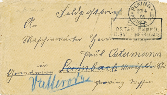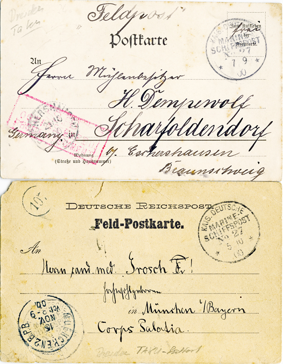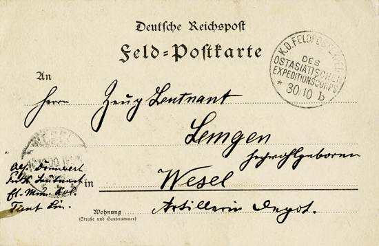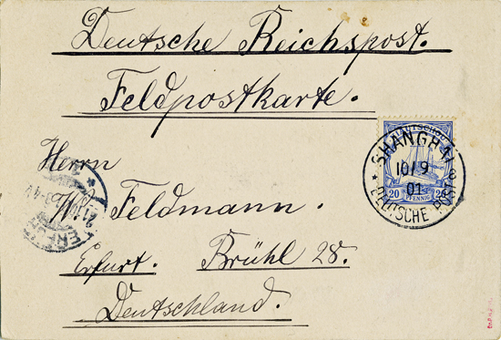 26.11.1900, vor Eröffnung der Feldpoststation Shanhaikuan: Feldpostkarte geschrieben in "Ling-Schong i.Novmb 1900" mit Stempel K.D.FELDPOSTSTATION No 4 & blauem SB-Stempel "OSAS. EXPED. I.BAT. 2.INF-REGMTS" nach CRIMMITSCHAU (17.01.01); ArGe 300,-.