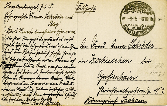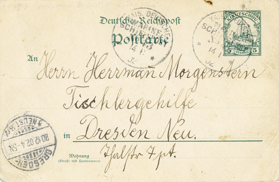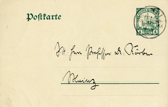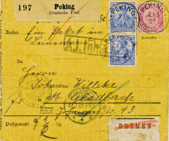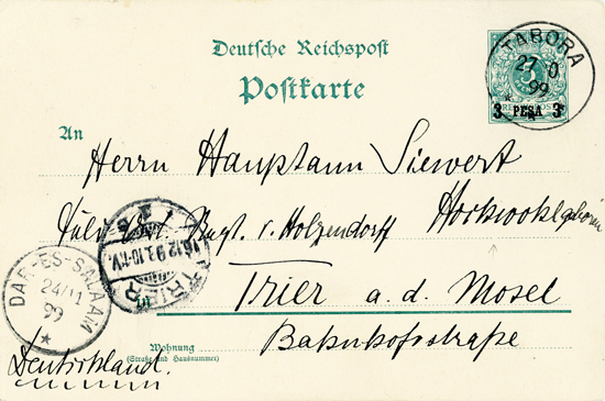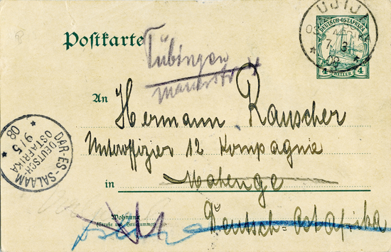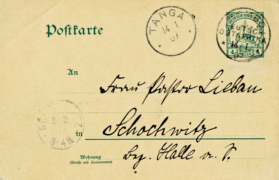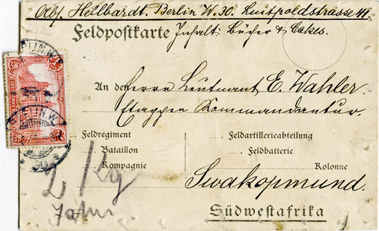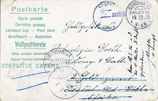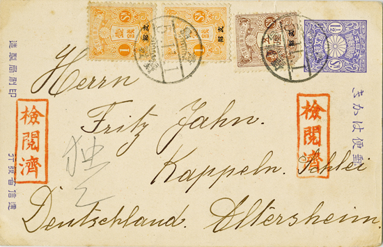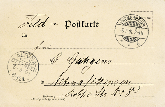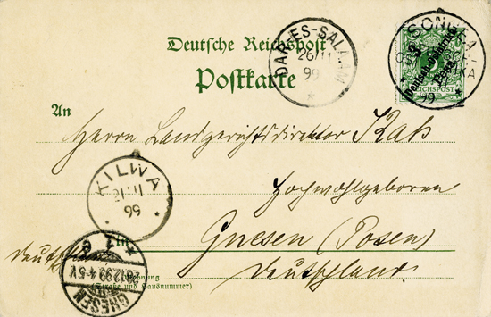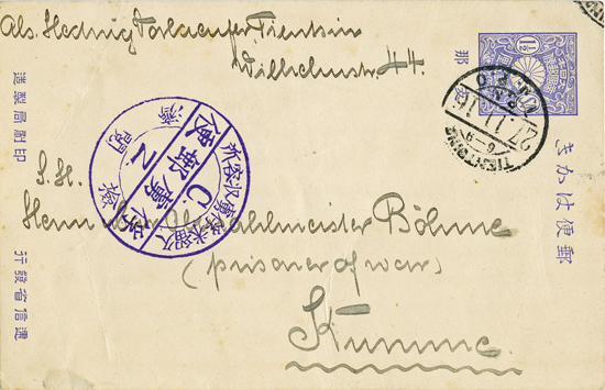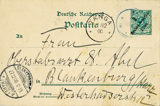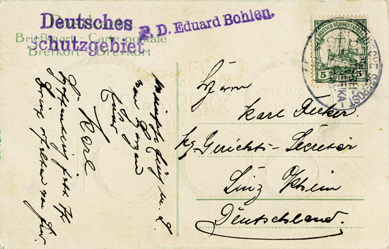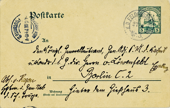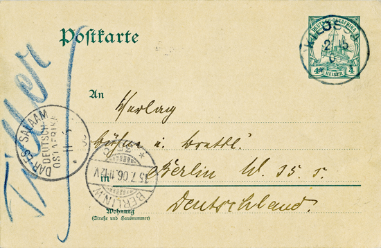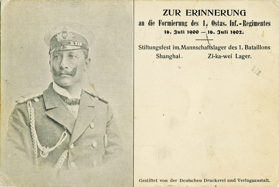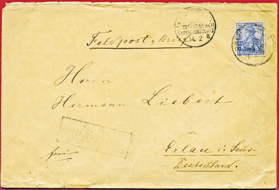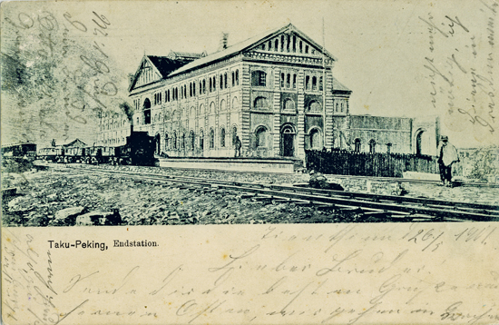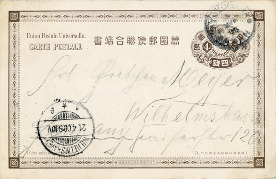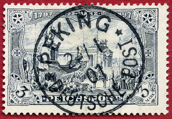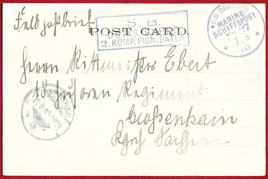 26.11.1900, vor Eröffnung der Feldpoststation Shanhaikuan: Feldpostkarte geschrieben in "Ling-Schong i.Novmb 1900" mit Stempel K.D.FELDPOSTSTATION No 4 & blauem SB-Stempel "OSAS. EXPED. I.BAT. 2.INF-REGMTS" nach CRIMMITSCHAU (17.01.01); ArGe 300,-.