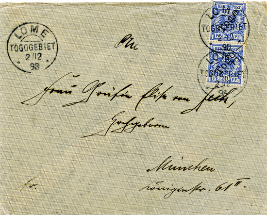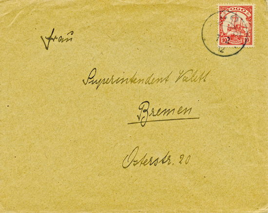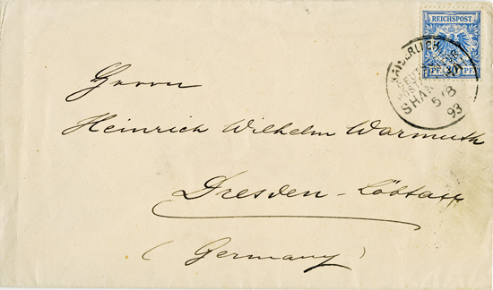 23.07.1895: 20Pf (Mi.V48d) mit 2 x Stempel LOME TOGOGEBIET auf Brief mit Leitvermerk "per Gertrud Woerm." an H. Henke in BREMEN (28.8.95), Umschlag faltig.
