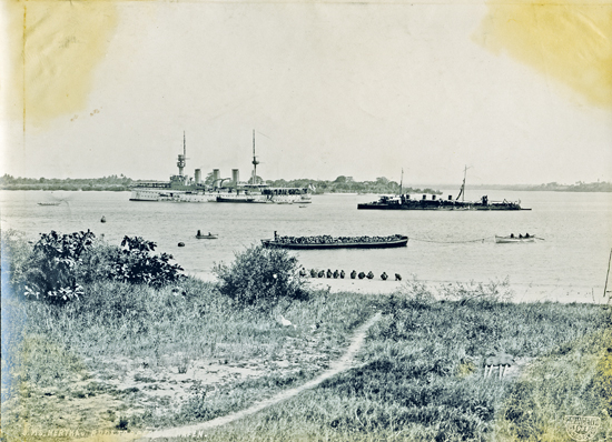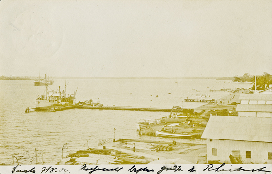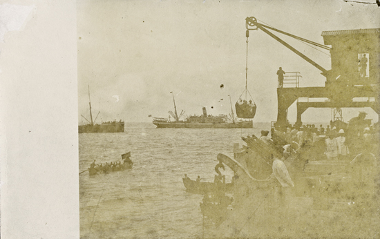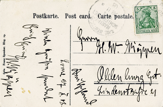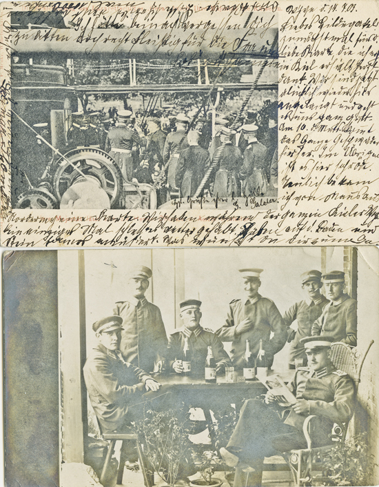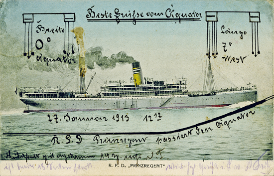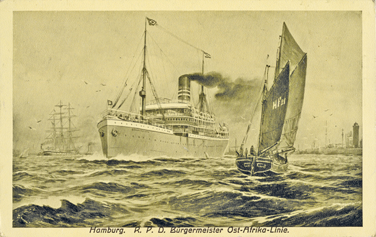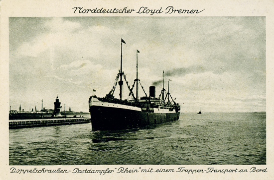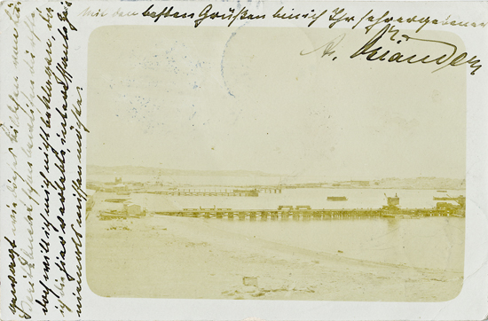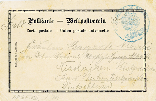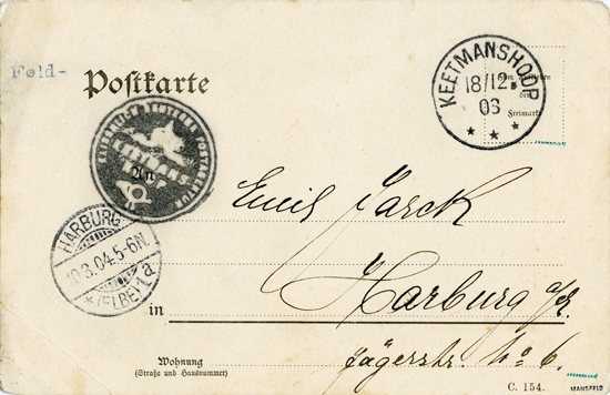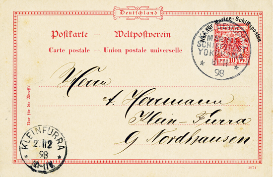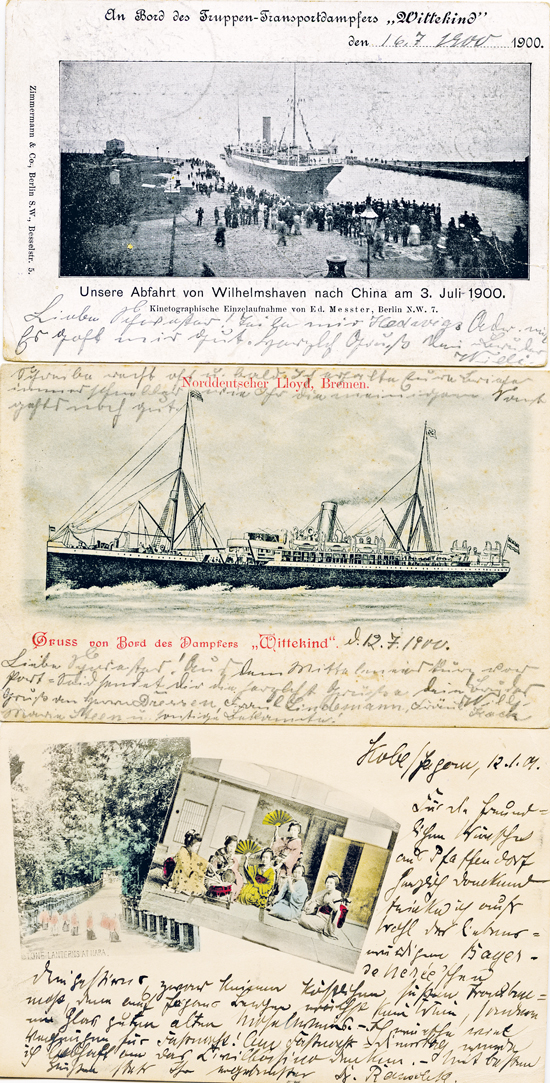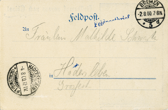13.09.1900: Feldpost-Ansichtskarte "Bremerhavener Kaisertage. Anbordschaffen des Gepäcks der Ostasiatscihen Truppen" mit Seepoststempel MSP No.68 (SMS "Arcadia") an die Frau eines Korvetten-Kapitäns in HAMBURG (26.9.1900).