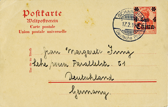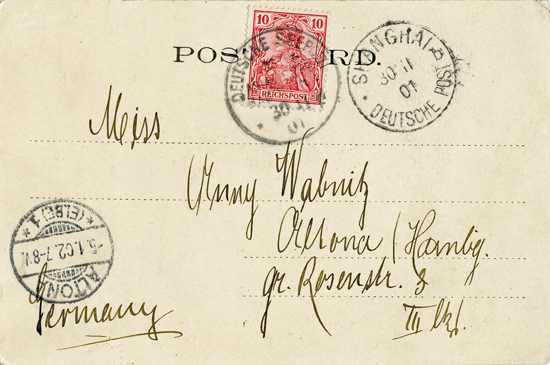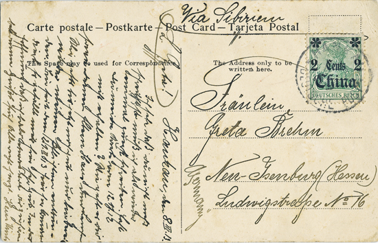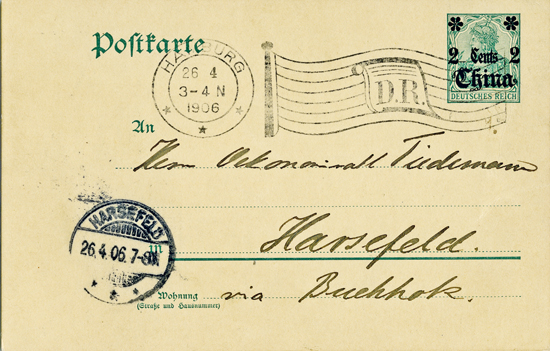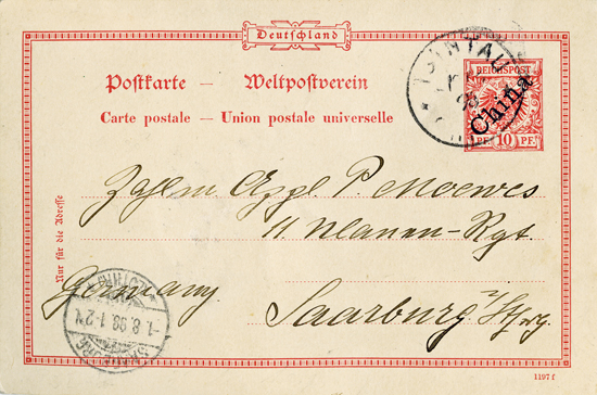 1898: Bedarfskarte mit DR 10Pf und Stempel HAMBURG (13.9.1898) nach China, Ankunftsstempel TIENTSIN KDPA (22.10.1898).