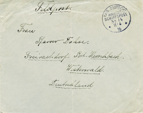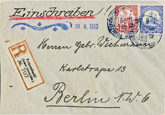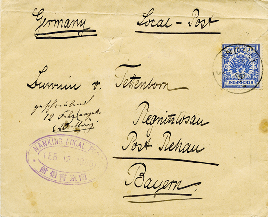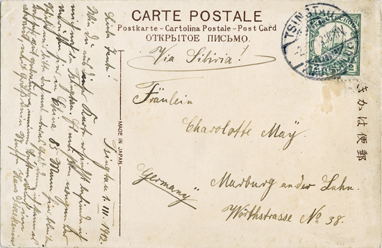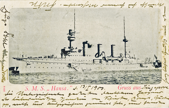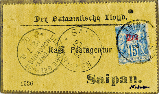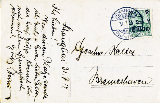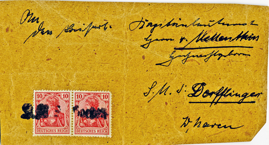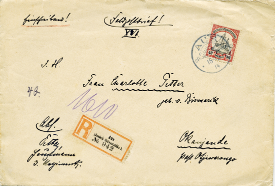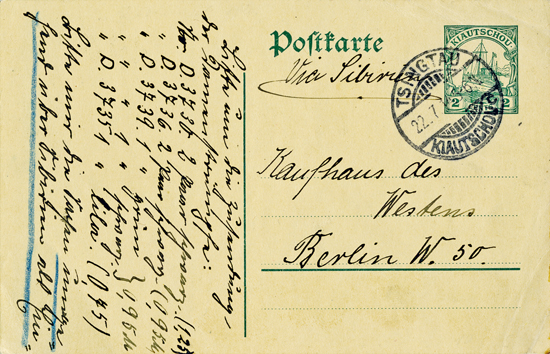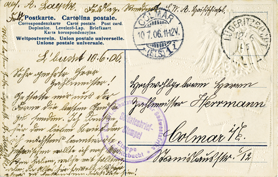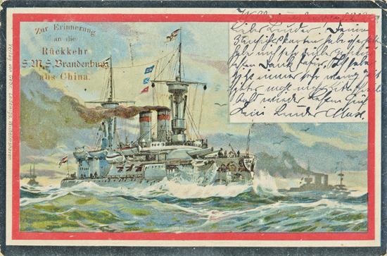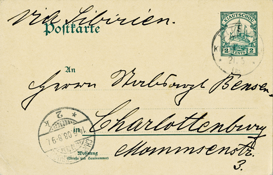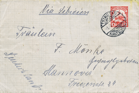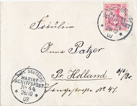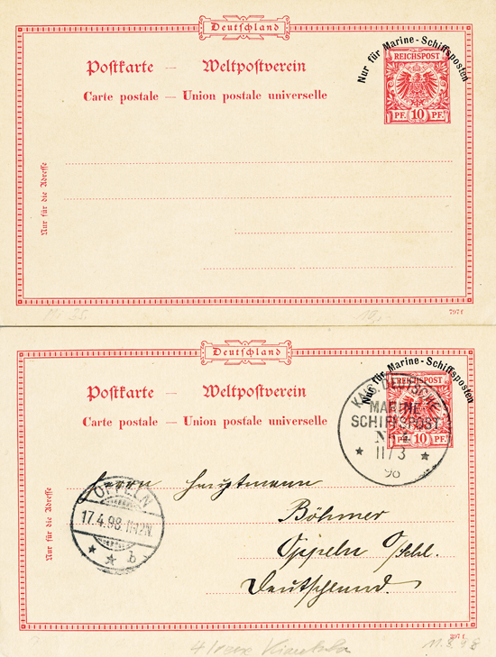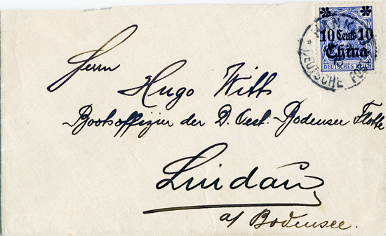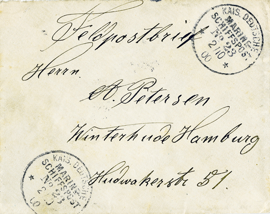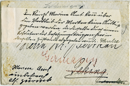 28.05.1910: Brief als "Marinesache" und L3 "Kommando / SMS Vaterland / B.No 621 I" mit Stempel SCHANGHAI"b" an die "Kaiserliche Werft" in TSINGTAU (31.5.10); rs blauer Briefstempel der "SMS Vaterland"; Klappe Mängel.