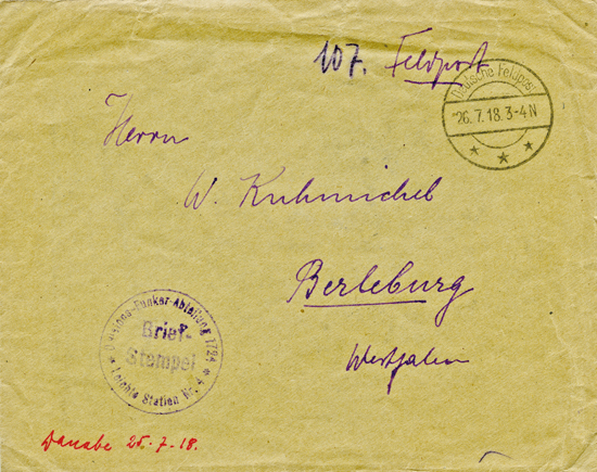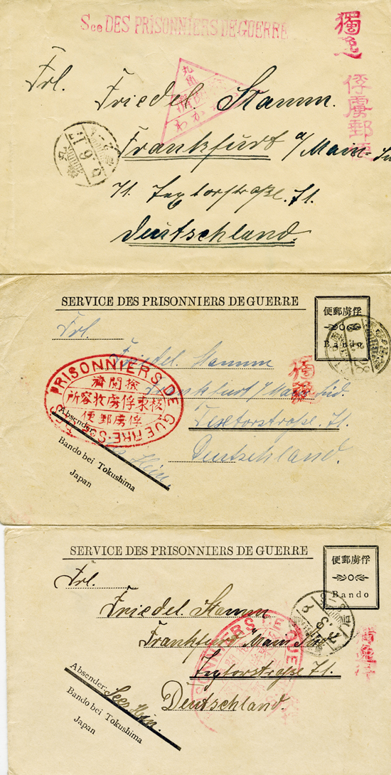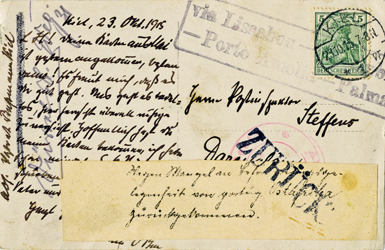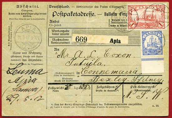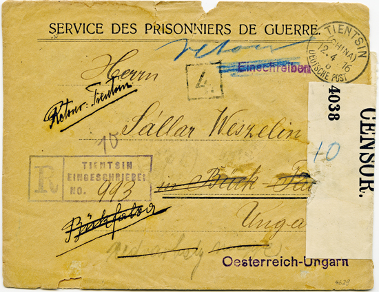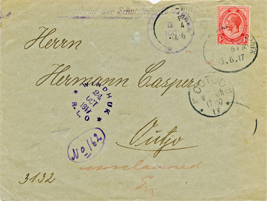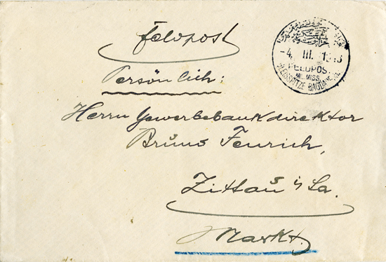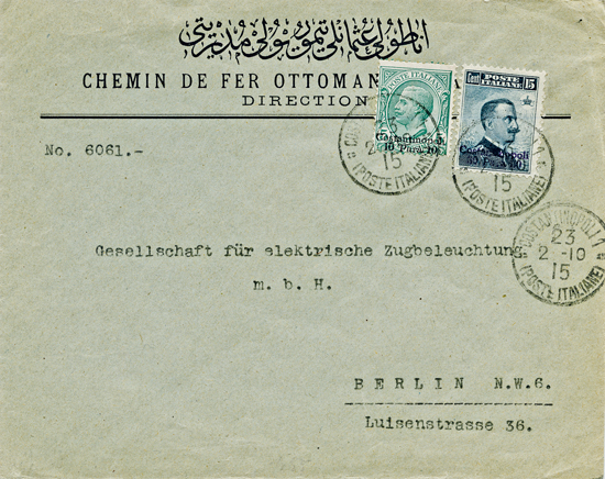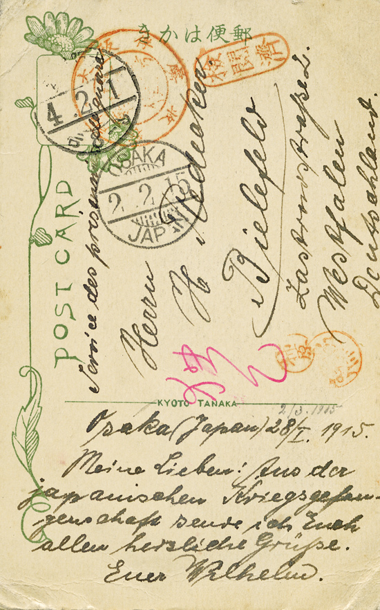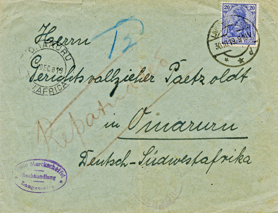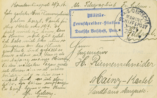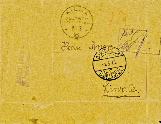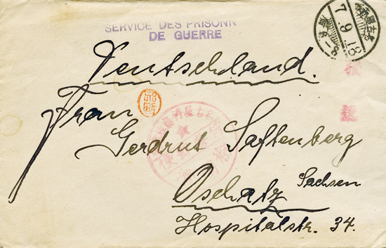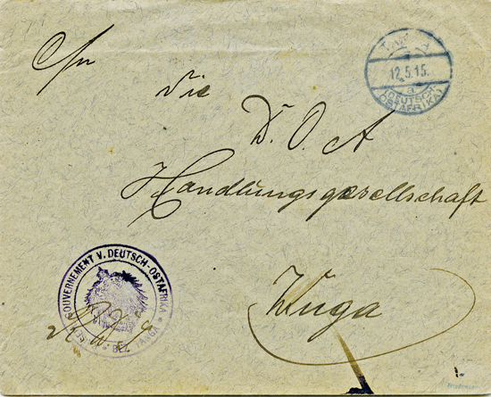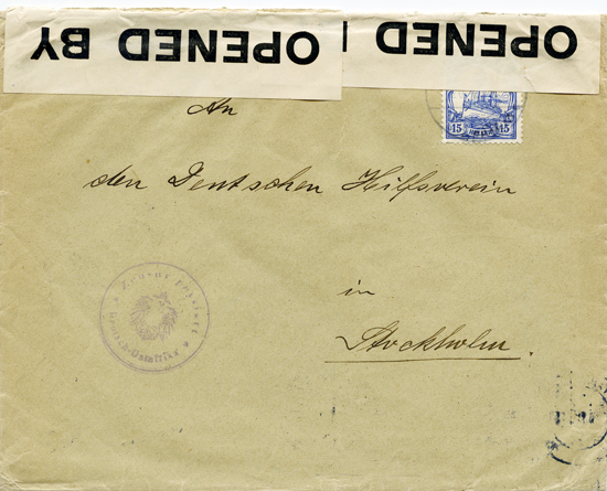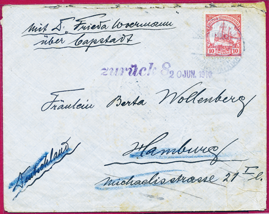 28.05.1910: Brief als "Marinesache" und L3 "Kommando / SMS Vaterland / B.No 621 I" mit Stempel SCHANGHAI"b" an die "Kaiserliche Werft" in TSINGTAU (31.5.10); rs blauer Briefstempel der "SMS Vaterland"; Klappe Mängel.