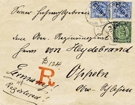 03.08.95: 2 x 20 Pf Krone/Adler (Mi.V48) auf Vorläufer Einschreibe-Brief der Deutsch-Asiatischen Bank, entwertet TIENTSIN, nach BERLIN (14.9.95).