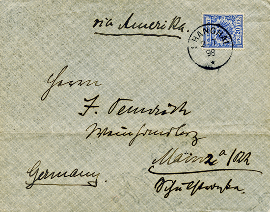 02.07.1898: DR 20Pf (Mi.V48d) mit kleinem Stempel SHANGHAI auf Brief mit Leitvermerk "via Amerika" an eine Weinhandlung in Mainz (9.8.98); Bugspur.
