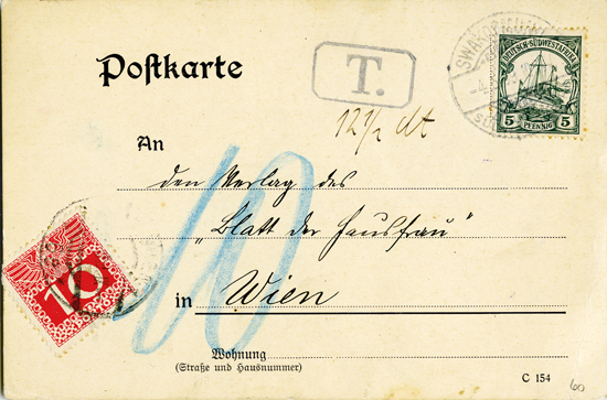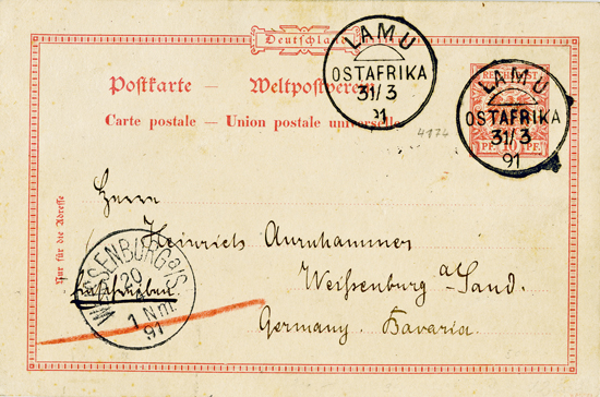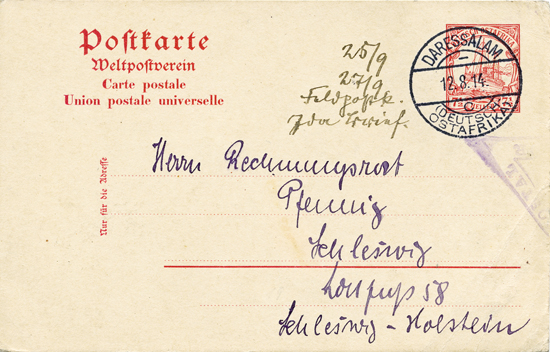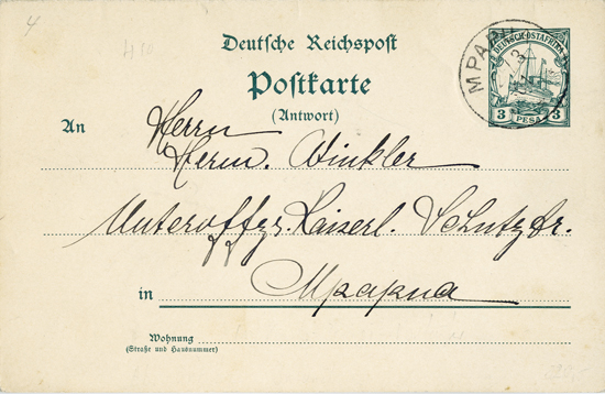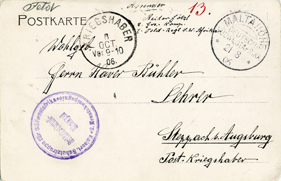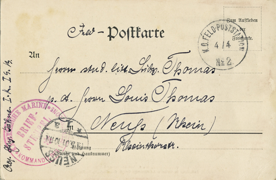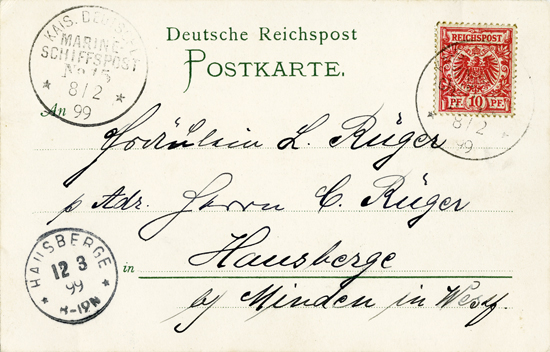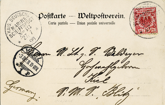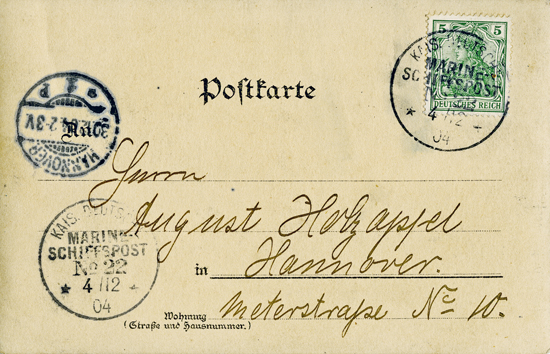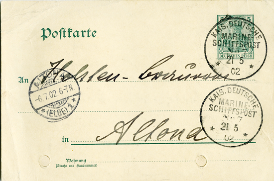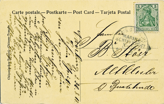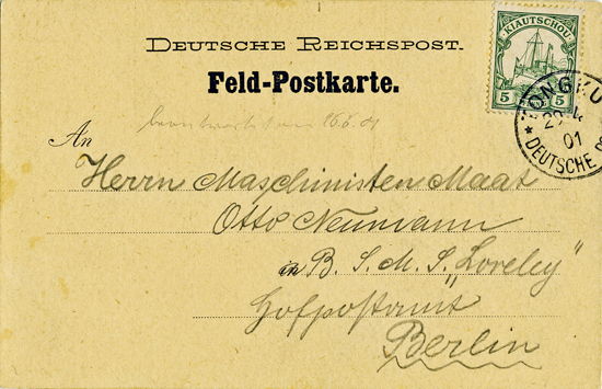 13.08.1901: Feldpostkarte mit Seepoststempel MSP No.71 (= SMS Neckar) an den "Feldpostsekretär Zeitinger in Tongku"; Post von der Liegezeit in China & auf der Heimreise.