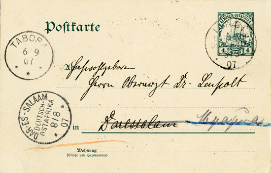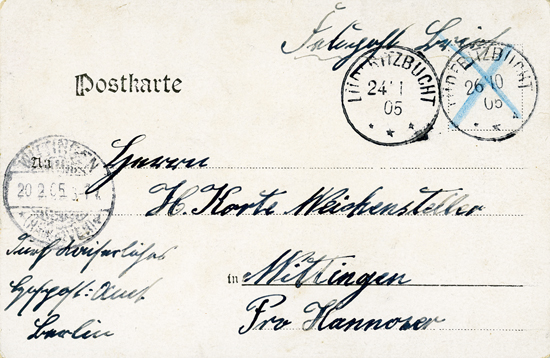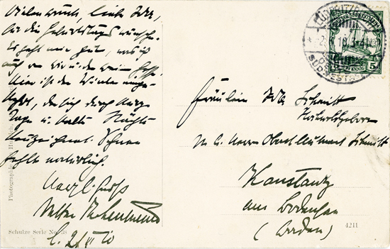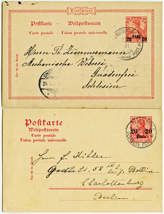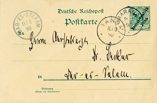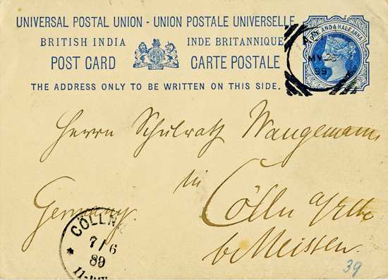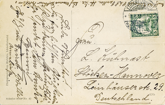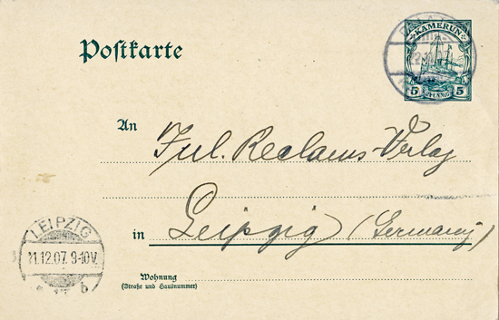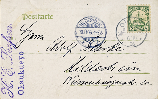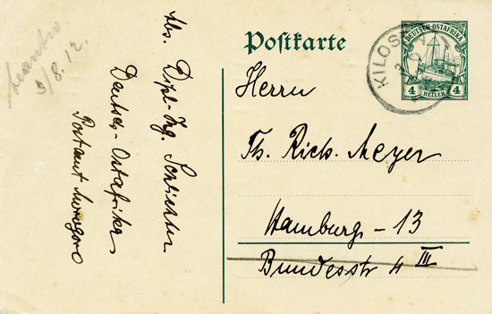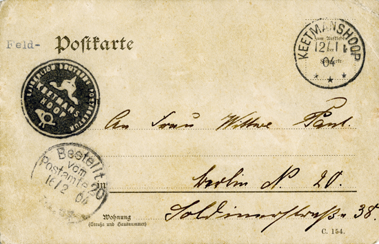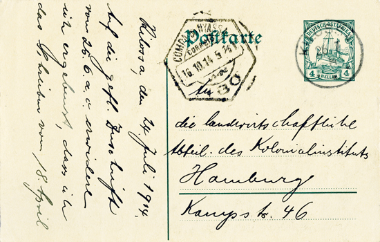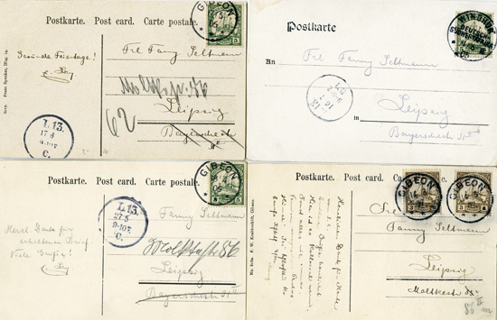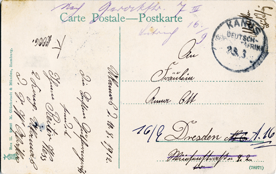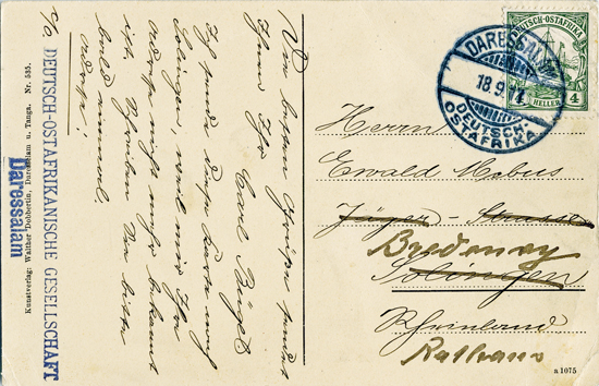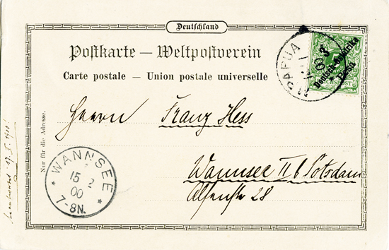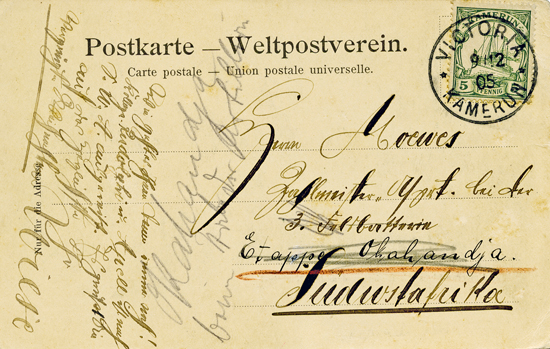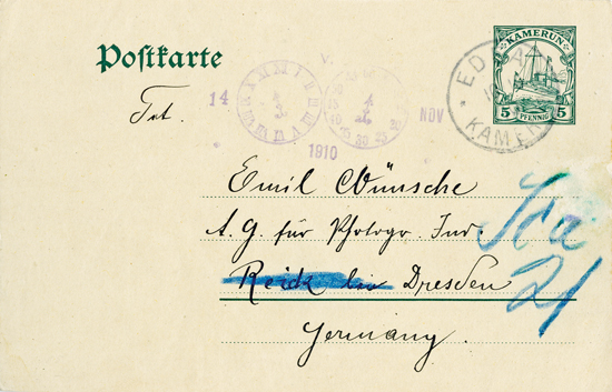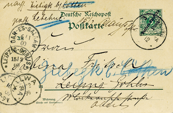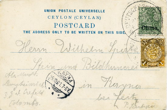 13.09.1899, Korrespondenz "Emma Schrader": kleines Lot von 5 Ansichtskarten "Wie Hagenbecks Ceylon-Thee wächst, wie er gepflückt und behandelt wird". Durchnummeriert von 1 bis 5, wird gezeigt: die Pflanze, die Ernte, das Abwiegen, das Sortiern und Verpacken des Tees. Alle Karten mit DR 10Pf und Seepoststempel OST-ASIATISCHE HAUPTLINIE aus Colombo (Ceylon) an Emma Schrader in BRAUNSCHWEIG (15.9.1899).