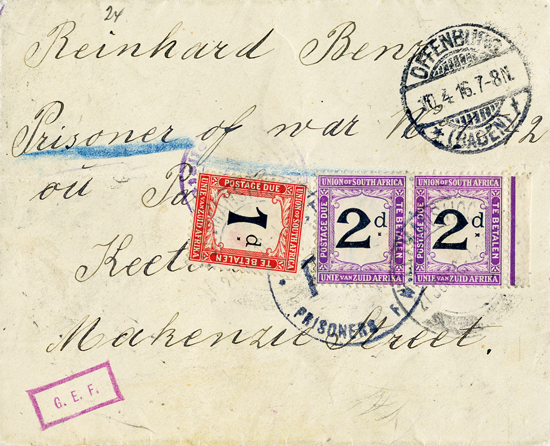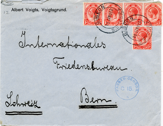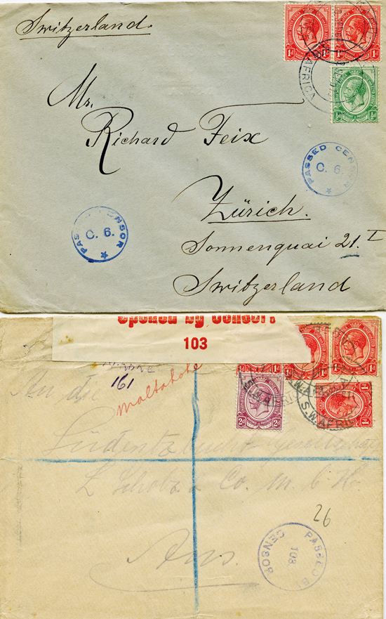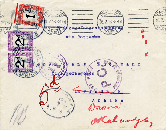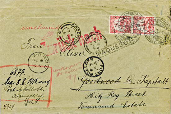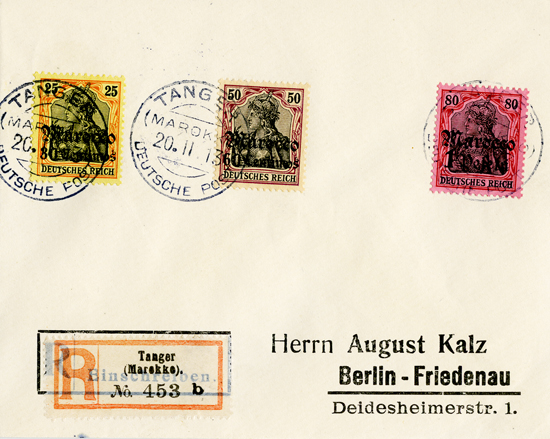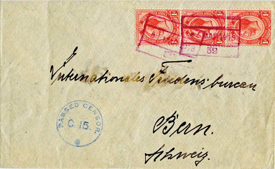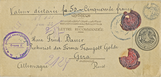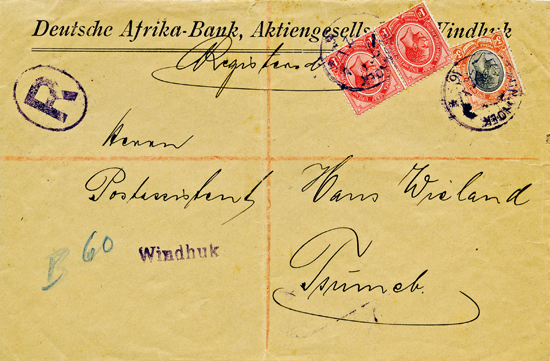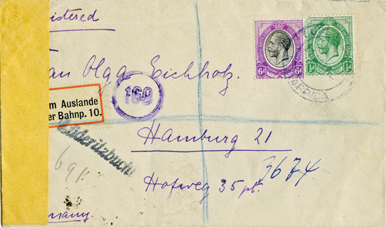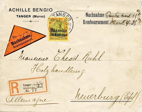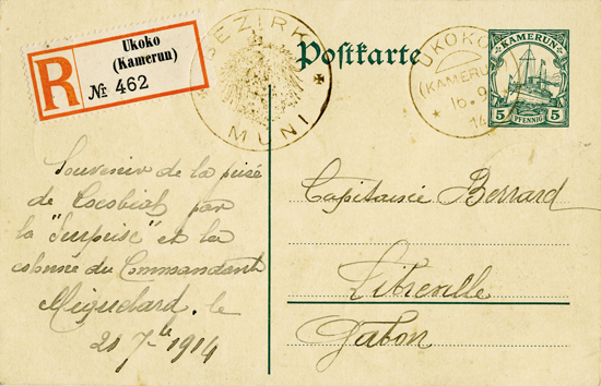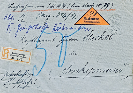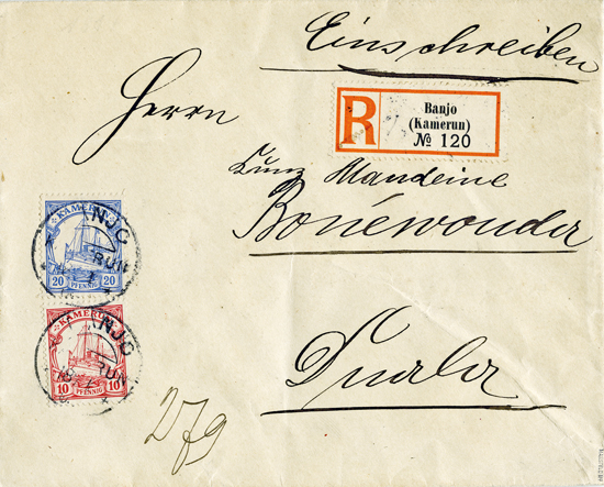 15.10.1919, Französische Besetzung: 1Fr, 2Fr und 5Fr (M.39,40,41) mit je Stempel ATAKPAME TOGO auf R-Brief nach Paris. Rückseitig deutscher Transitstempel ANECHO (17.10) sowie französische Stempel GRAND-POPO DAHOMEY (18.10) und COTONOU DAHOMEY (19.10).