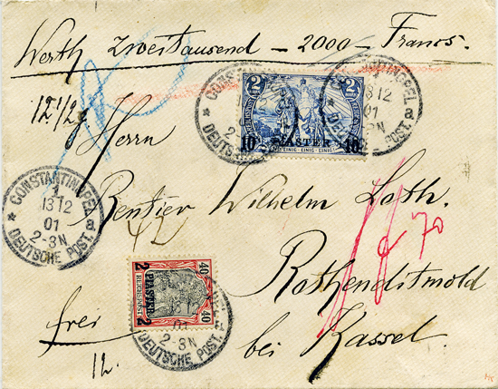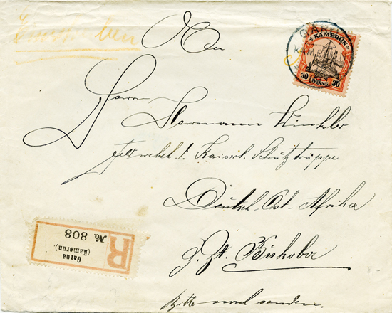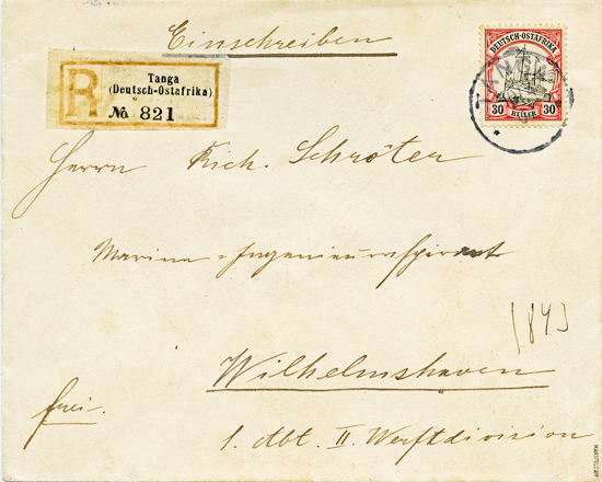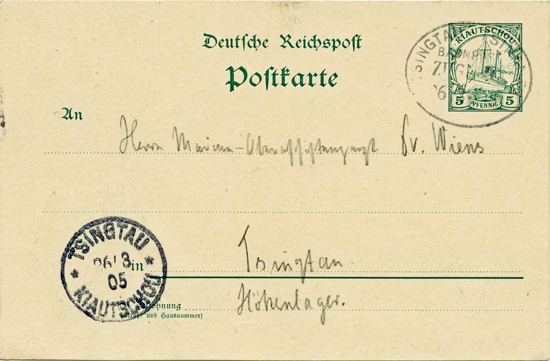29.05.1901: Brief als "Marinesache" und L2 "Gouvernement Kiautschou H.Buch No 5390" mit Stempel TSINGTAU"a" an das "Kaiserliche Kommando der II.Werftdivision" in WILHELMSHAVEN (7.7.1901); rs blasser Adlerstempel.