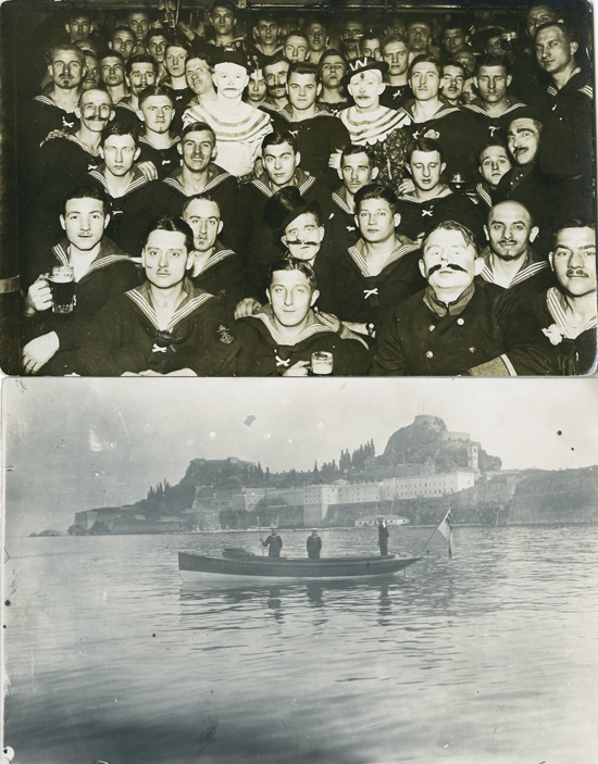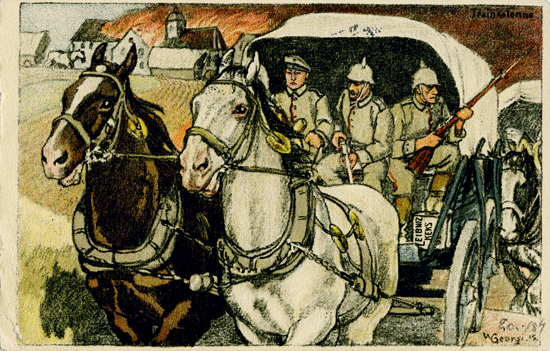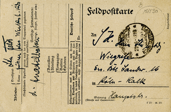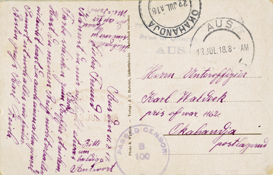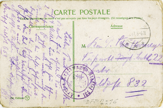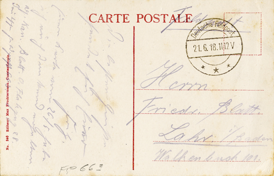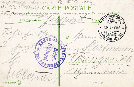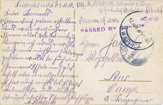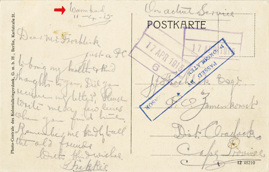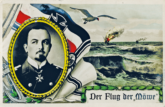 30.05.16: Feldpost-Ansichtskarte "Der Flug der Möwe" (die "Möwe" versenkt engl.Schiff vor der westafrikanischen Küste) mit Stempel MSP Nr.107 (SMS "Derrflinger") nach Rieder.