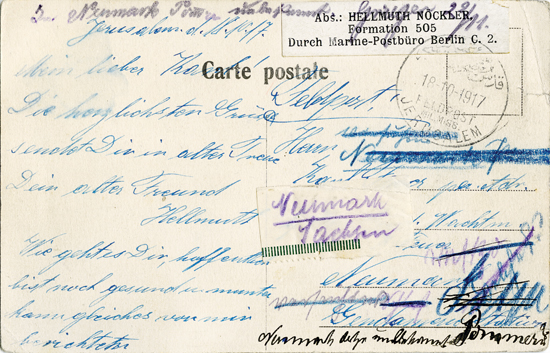 17.05.1917: Bedarfs-Feldpostkarte (Borkum - Meeres Wogen) mit seltenem Briefstempel KAISERLICHE MARINE S.M: PEILBOOT V. nach Zwickau.