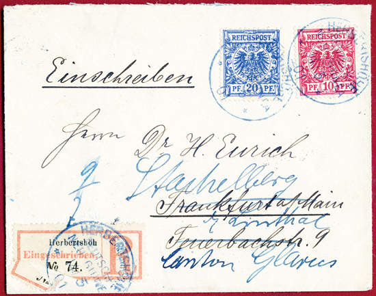 14.06.1890: Paar 20Pf Vorläufer (Mi.V42c) mit Stempel KDPA SHANGHAI auf Luxusbrief als Einschreiben der 2.Gewichtsstufe mit R-Zettel "Shanghai" (Type 2) mit Weiterleitungsvermerk "By French Mail" an Herrn Pollack in BERLIN (23.7.90, AkSt rückseitig); geprüft Jäschke-Lantelme.