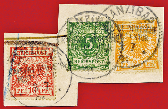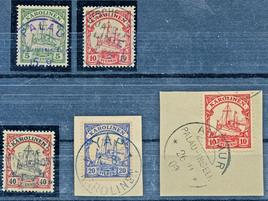 1898: kleines Lot von sauber gebrauchten 3Pf bis 25Pf (Mi.2II bis 5II, China Aufdruck 56%), insgesamt 5 Marken und 2 Briefstücke darunter Stempelabschlägen von Shanghai, Tsingtau & K.D.FELDPOSTATION & K.D.Feldpostexped des Ostas. Exped. "a".