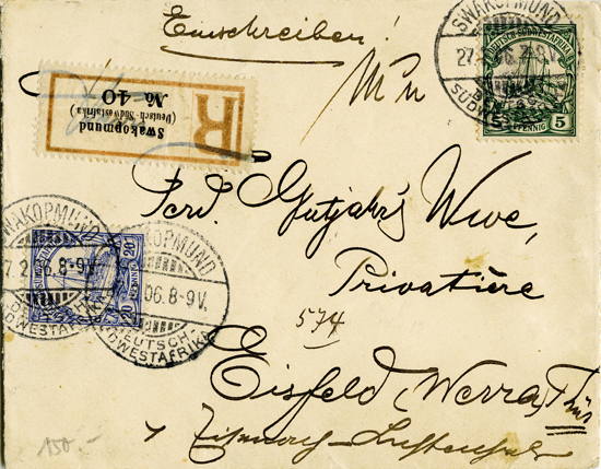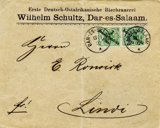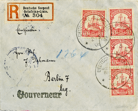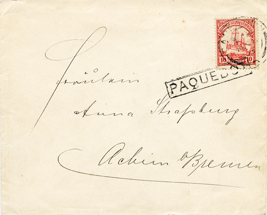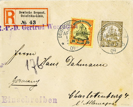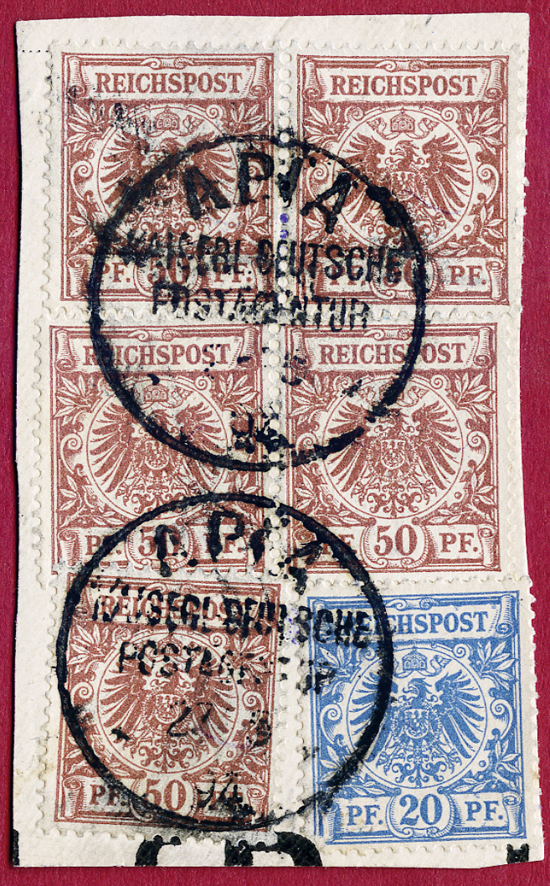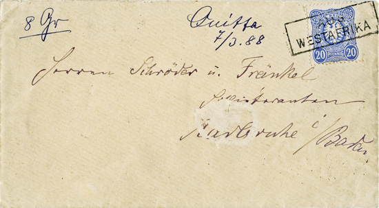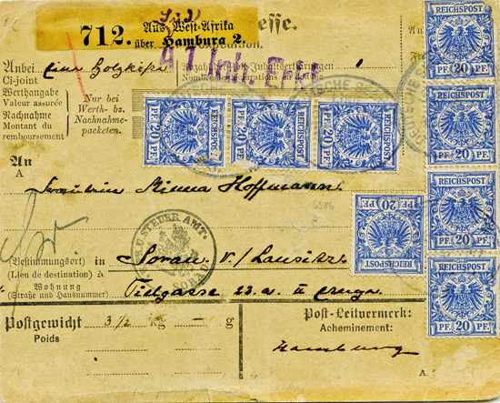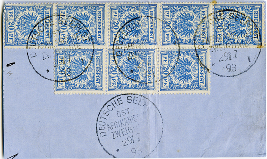 04.08.1897: portogerechter Firmenbrief "d'Almeida Brothers &Co., Klein-Popo" mit 4x 20Pf (Mi.V48d) und 4x Seepoststempel DSLHW "IX" und Weiterleitungsvermerk "Per S S Hedwig Woermann" an Herrn Paul in BREMEN (rückseitiger Ankunftsstempel vom 13.9.1897 sowie rotes Lacksiegel der Firma). Beförderungsspuren und kleiner Einriß oben; Attest Dr.Steuer.