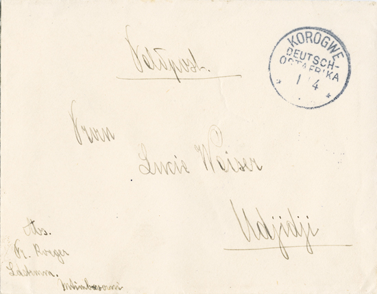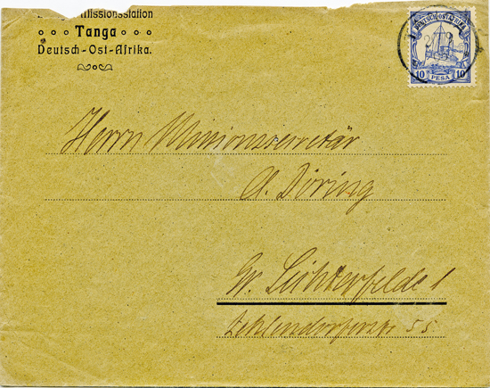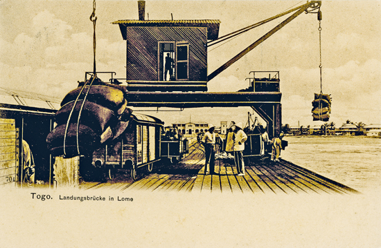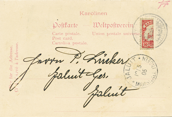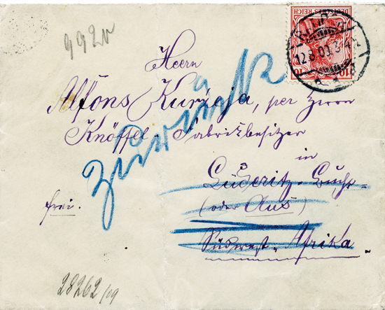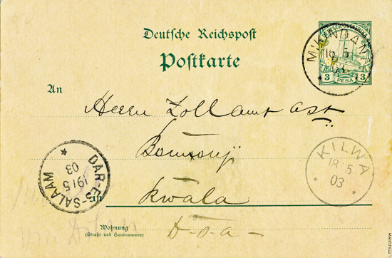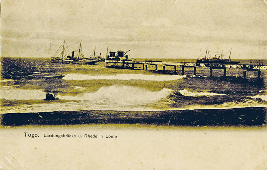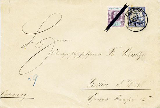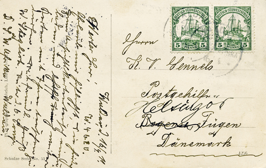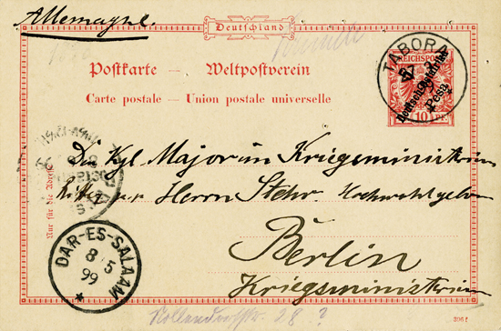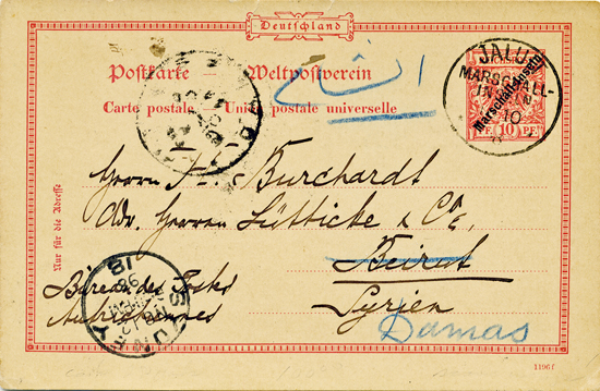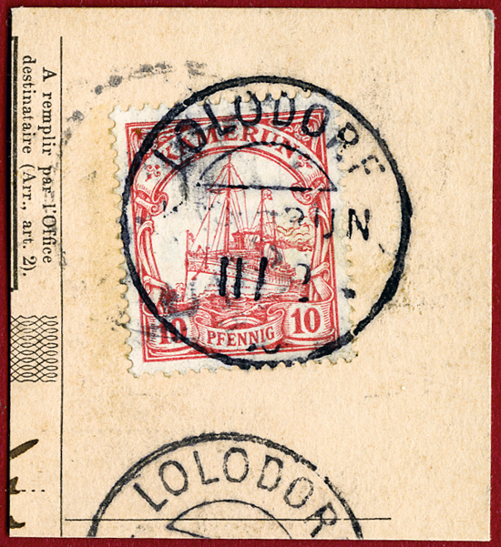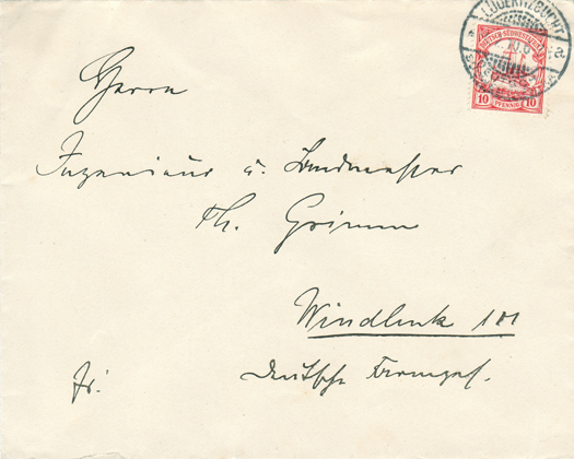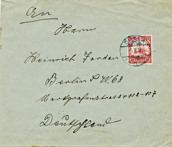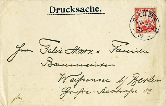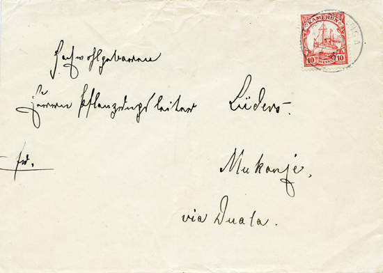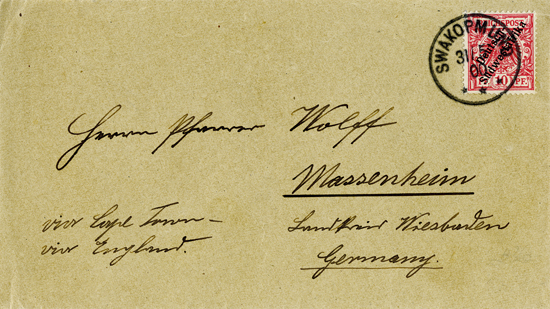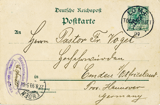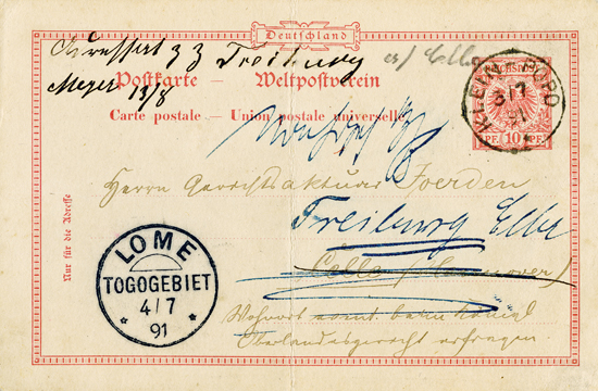 30.03.1904: 10Pf (Mi.9) mit schwachem Seepoststempel DSLHW und Weiterleitungsvermerk "p.D.Khalif" auf Firmenbrief "Liebau & Clasen, Lome, W. K. Africa" mit schwarzem L2 "Deutsches Schutzgebiet" an die deutsche Geschäftsstelle in HAMBURG (??.05.1904).