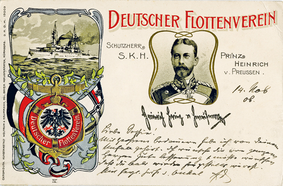 14.11.06: Farblitho-Ansichtskarte "Deutscher Flottenverein" (Kriegsschiff, Prinz Heinrich von Preussen, Wappen des Vereins) als Ortspostkarte in München verwendet.