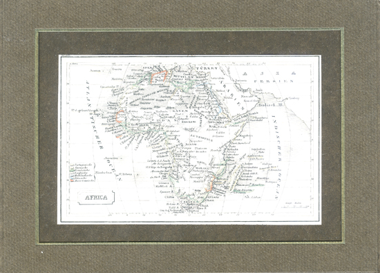 ca.1840: frühe deutsche (handkolorierte) Afrikakarte (14,5 x 9 cm), welche die interessierten Kolonialmächte auf dem afrikanischem - und vorderorientalem Raum zeigt.