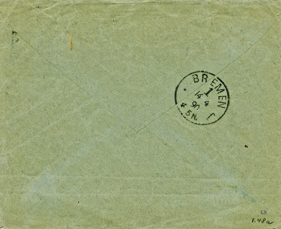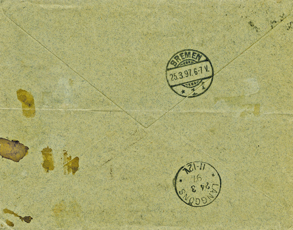 17.02.1897: Vorläufer 10Pf, 20Pf & 50Pf (Mi.V47, V48, V50) mit 3x Stempel LOME auf R-Brief mit R-Zettel "Lome" (Type 1a) an den Missionar H.Diehl, weitergeleitet über LANGGÖNS (24.3.) nach BREMEN (25.3.97).