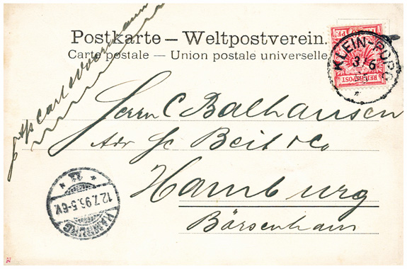 03.06.1896: Ansichtskarte "Gruss aus Togo (3 Motvie: Postboten Klein-Popo, Landeshauptmannschaft in Sebbe bei Klein Popo, Rhede und Strand in Klein Popo) mit Vorläufer 10Pf (Mi.V47d) und Stempel KLEIN-POPO sowie Weiterleitungsvermerk "Per Carl Woermann" nach HAMBURG (12.07.1896); geprüft R.Steuer BPP.