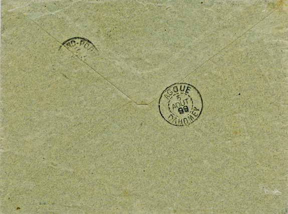 05.08.1899: portogerechter Inlands-Firmenbrief "Bernardo M.Almeida, Grand Popo mit 20Pf (Mi.V48d) und 2x Stempel KLEIN-POPO an einen Herren in "Grand Popo" mit rückseitigem Transitstempel AGOUE DAHOMEY & Ankunftsstempel GRAND-POPO.