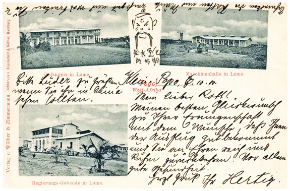 06.10.1910: Ansichtskarte "Togo / West-afrika (Motive: Gefängnis in Lome, Maschinenhalle Lome & Regierungs-Gebäue) mit 5Pf (Mi.8) und 2x Stempel KLEIN-POPO an Herrn Rott "z.z. China..". Absender ist der Postmeister Hertig aus "Klein-Pop".