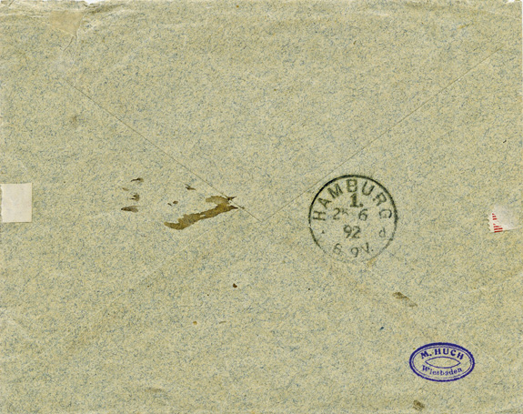 18.05.1892: Vorläufer Paar 20Pf (Mi.V48b) mit 2x Stempel LOME auf Firmenbrief "Armerding & Feist, Lome, W. C. Africa" als Einschreiben (fehlender R-Zettel, wahrscheinlich abgefallen) an die deutsche Geschäftsstelle in HAMBURG (25.06.1892).