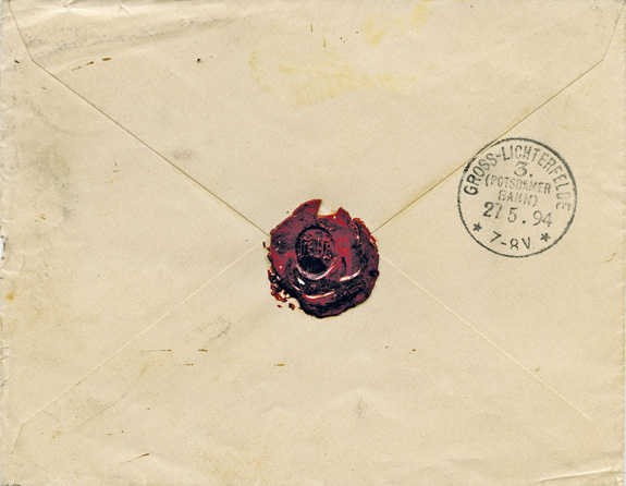 01.04.1894: portogerechte Brief mit erhabenem Firmensiegel "Franz Leuschner / Klein POPO" sowie Vorläufer 20Pf (Mi.V48d) mit Stempel LOME nach "GROSS-LICHTERFELDE / Potsdamer Bahn" bei Berlin (27.05.1894).