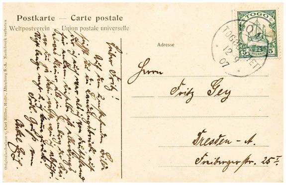 12.09.07: 5Pf mit Stpl LOME auf AK "Landungsbrücke u. Rhede in Lome" n.Dresden