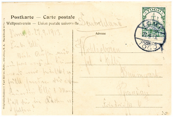 27.09.13: AK "Faktorei der D.T.G. in Nueppe" mit 5Pf (Mi.21) und Stempel LOME nach Spandau.